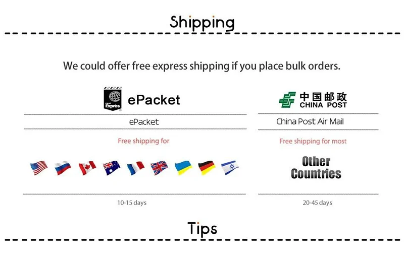 Packages from our warehouse in China will be shipped by ePacket or EMS depending on the weight and size of the product. Packages shipped from our US warehouse are shipped through USPS.