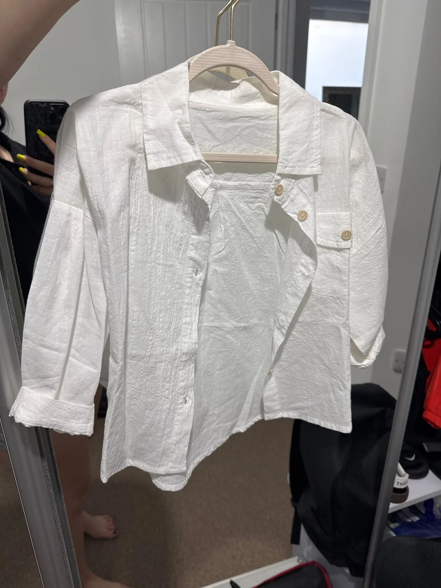 Gran camisa. Lo compré para mi hijo para la playa para protegerlo del sol... la calidad es excelente. Estoy deduciendo una estrella por la engañosa talla. La talla indicada es 80, pero en realidad es 90. Es aún más grande para mi hijo, que tiene 1.2 años...