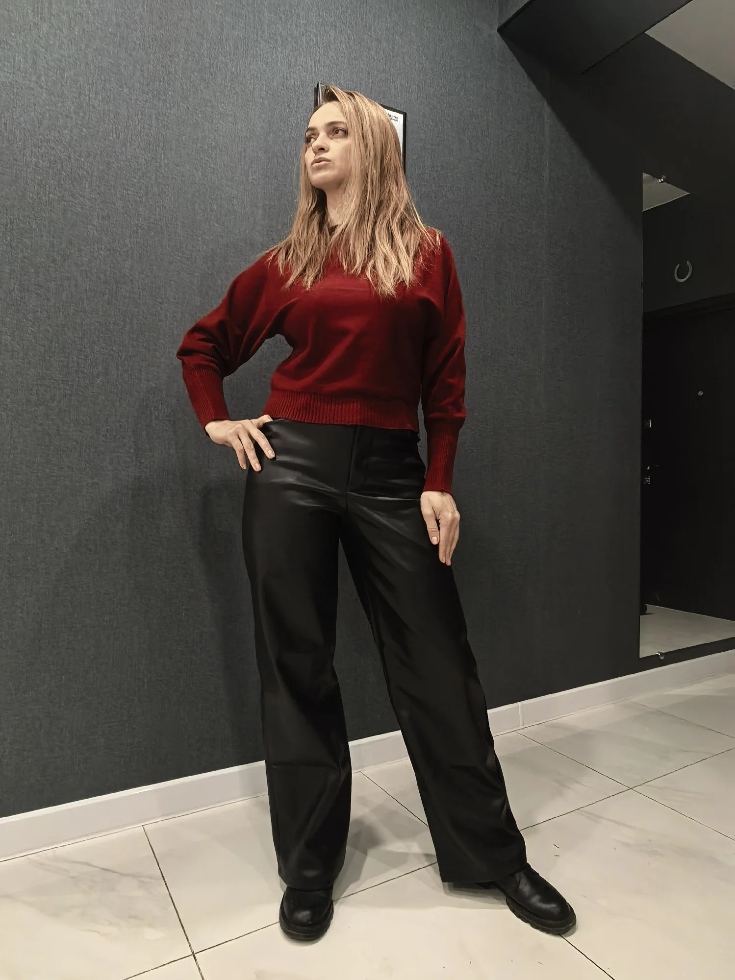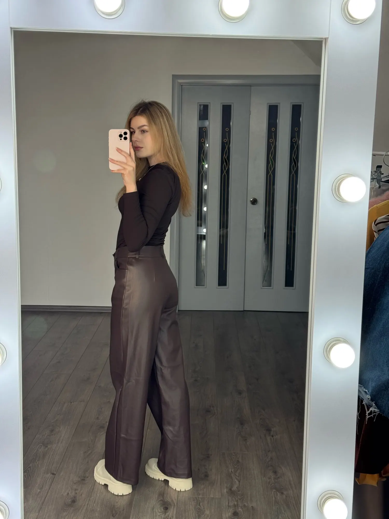 Piel delicada. Pero ten en cuenta que, para una altura de 168 cm, solo es adecuado para caminar en línea recta. Corto... pero para mis medidas 65-92 queda perfecto. Ni siquiera un sastre podría coserlo mejor. Los pantalones palazzo son rectos y anchos. Realmente muy agradables al tacto. Adjunto una foto desde el interior.
