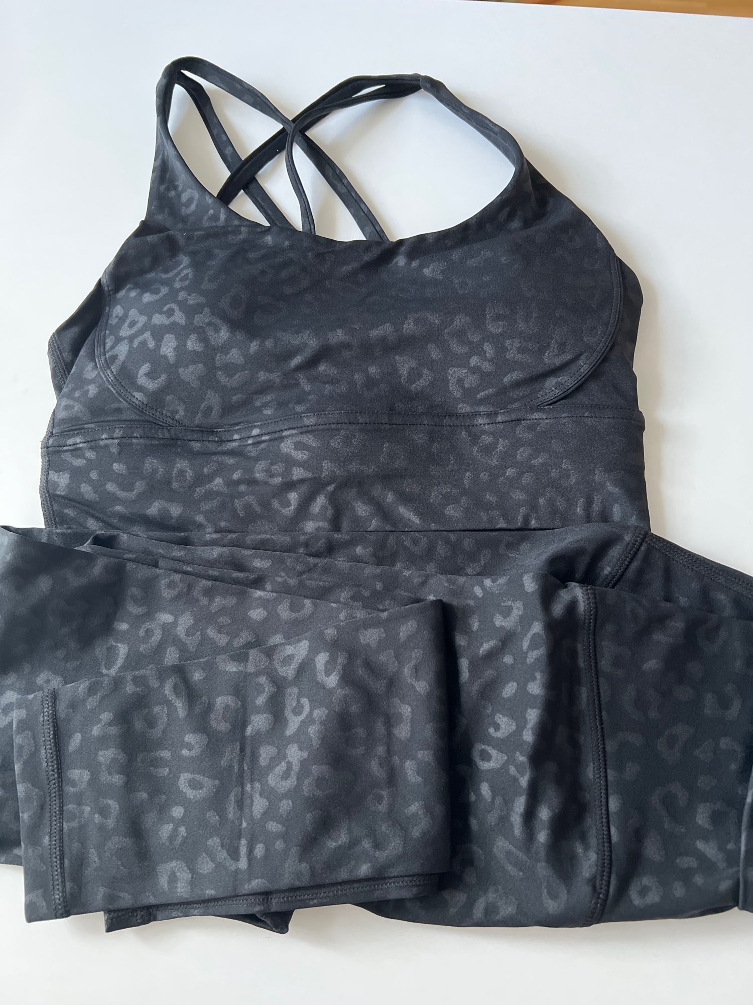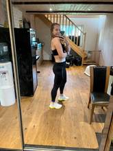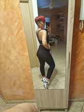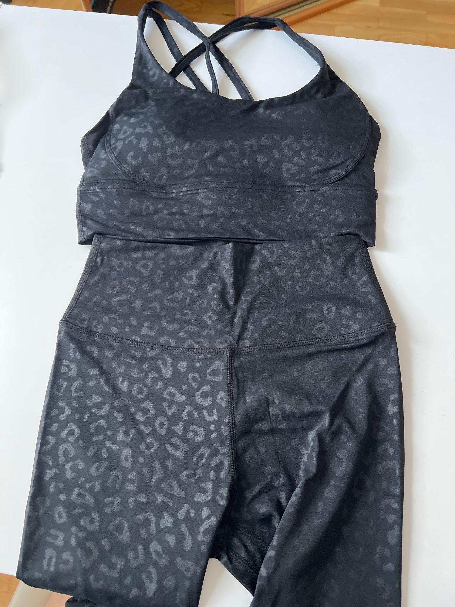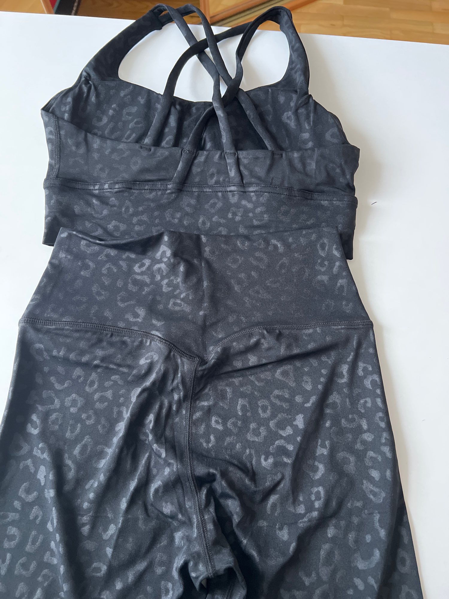 El traje no está mal. Leggings muy cortos, para una altura de 168 cm, tendrán una longitud de alrededor de 7/8. Se caen un poco al caminar porque no tienen elástico en la cintura, y el tejido es bastante delgado. No son transparentes, pero la tela es ajustada.