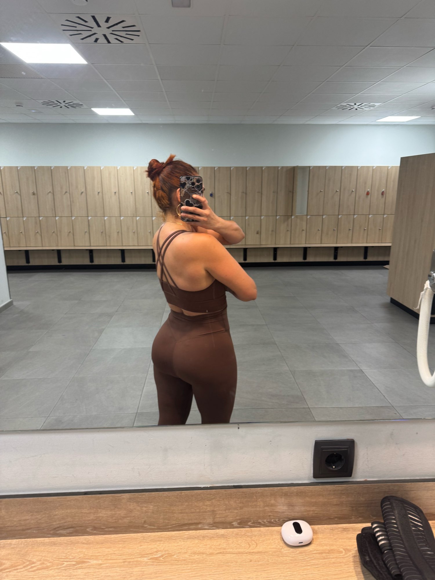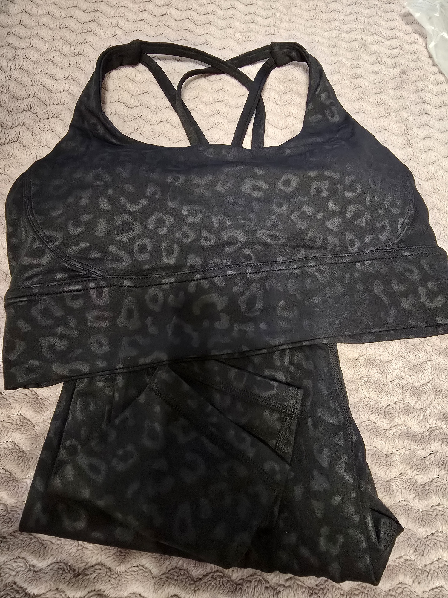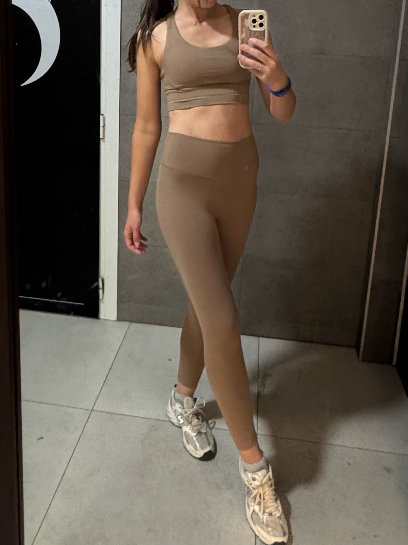 El traje no está mal. Leggings muy cortos, para una altura de 168 cm, tendrán una longitud de alrededor de 7/8. Se caen un poco al caminar porque no tienen elástico en la cintura, y el tejido es bastante delgado. No son transparentes, pero la tela es ajustada.