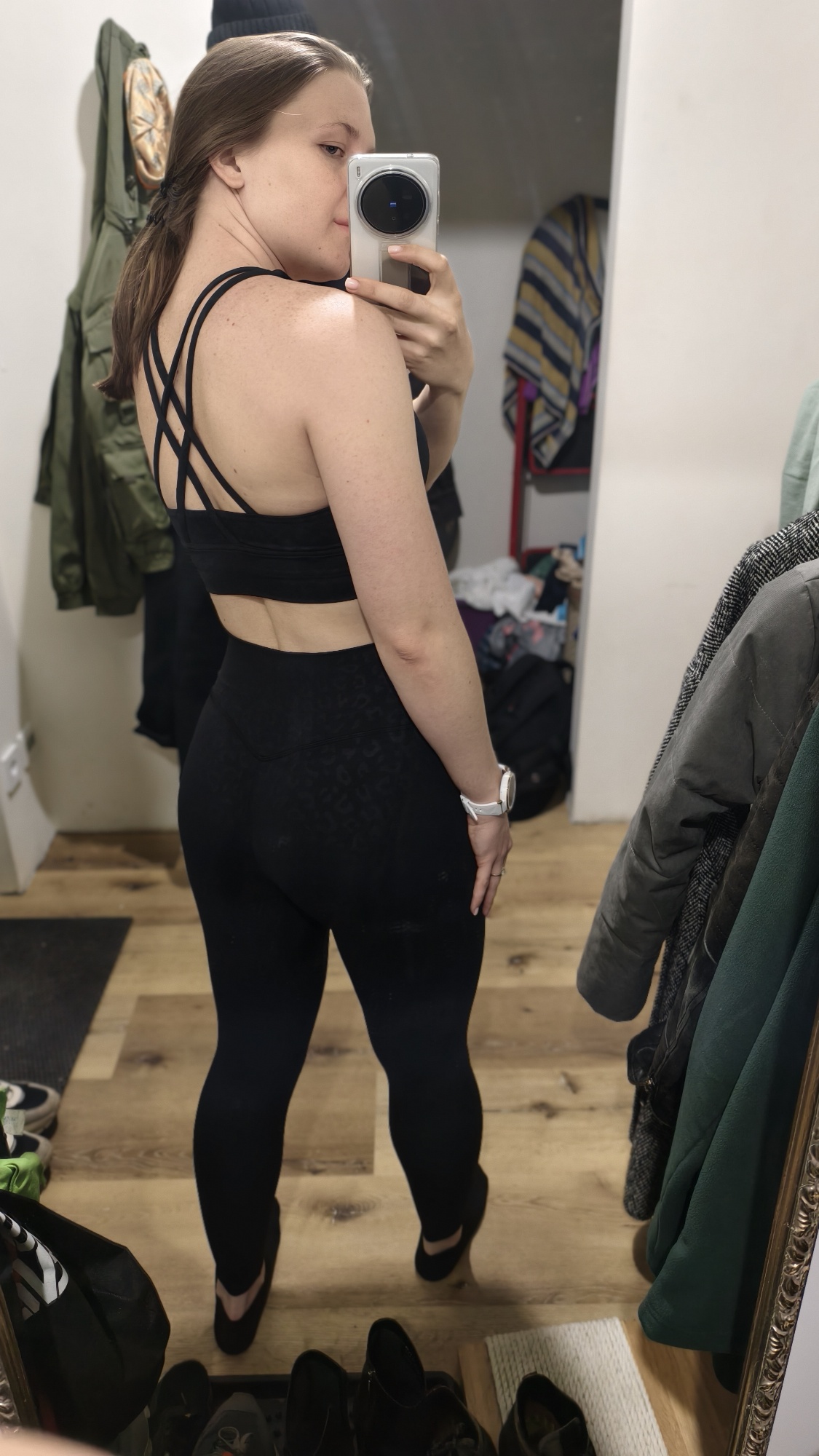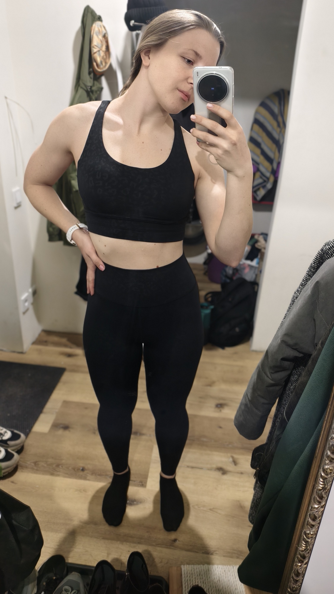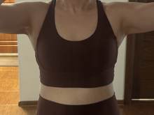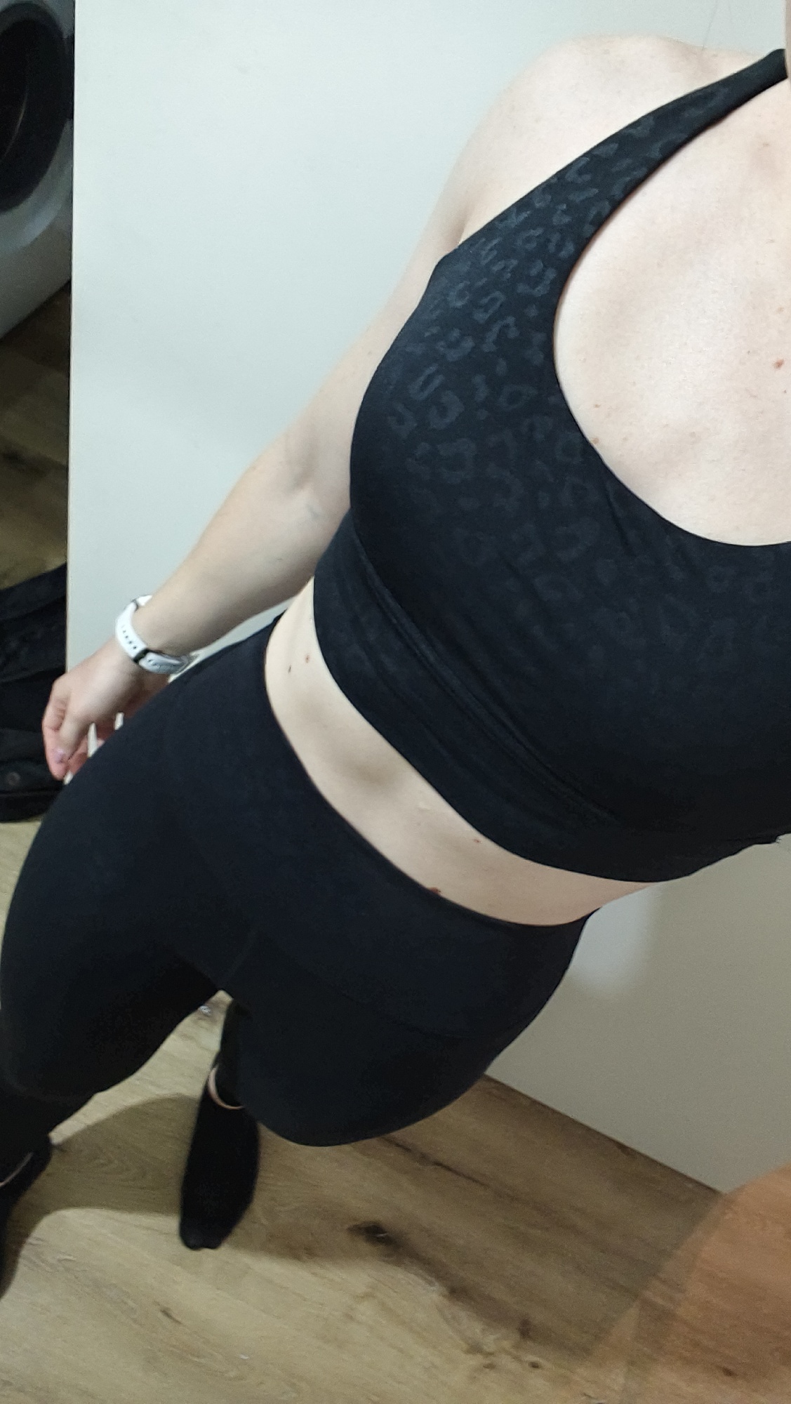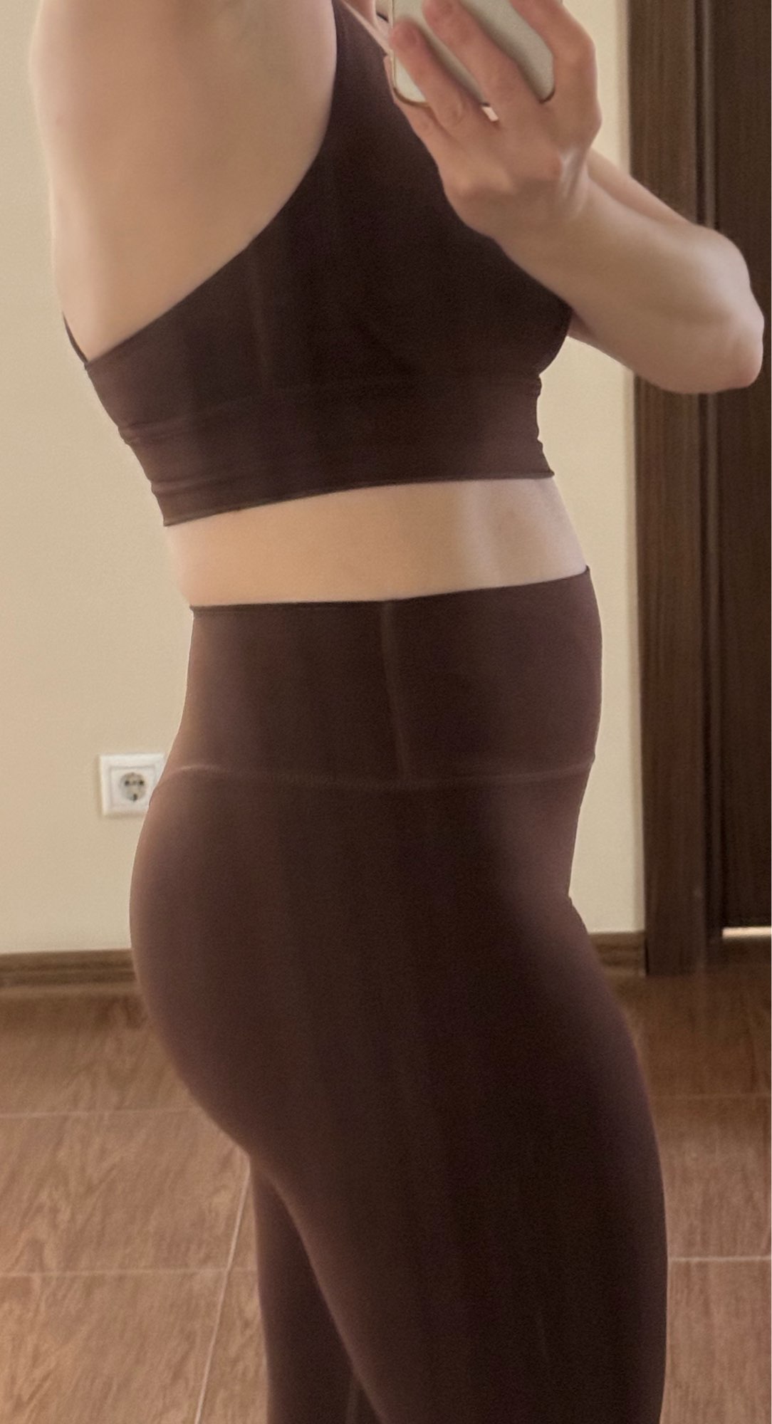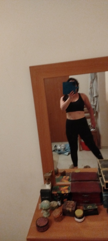 El juego de fitness está satisfecho. La tela es bonita y no ilumina. La talla M corresponde. Por una altura de 164, un peso de 62, los objetos de 90/74/95 llegaron bien. Sería mejor si la correa en la cintura fuera más gruesa. Un poco lento de préstamos durante el movimiento activo.