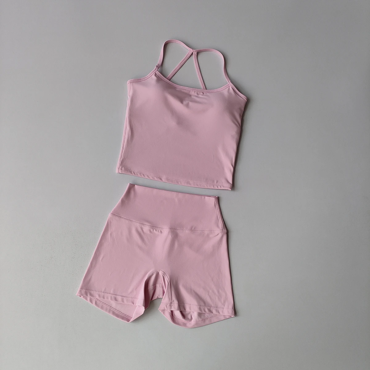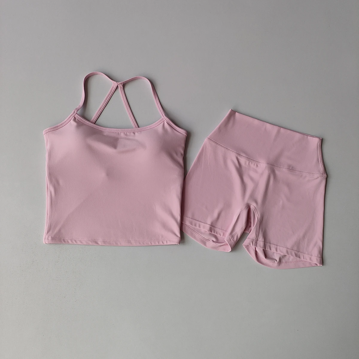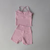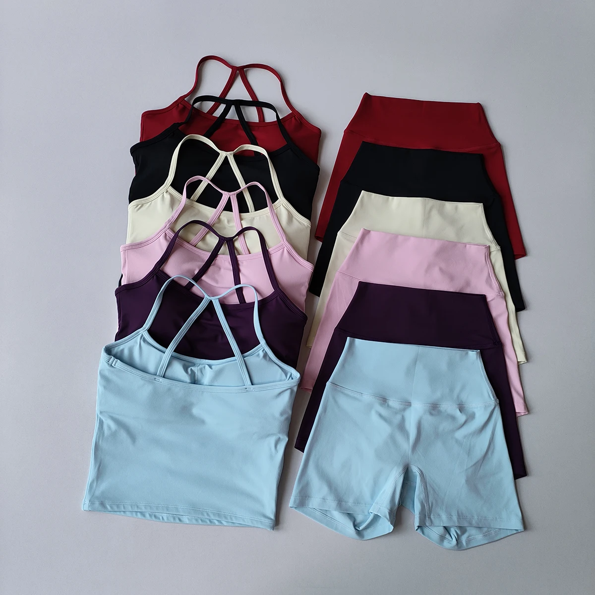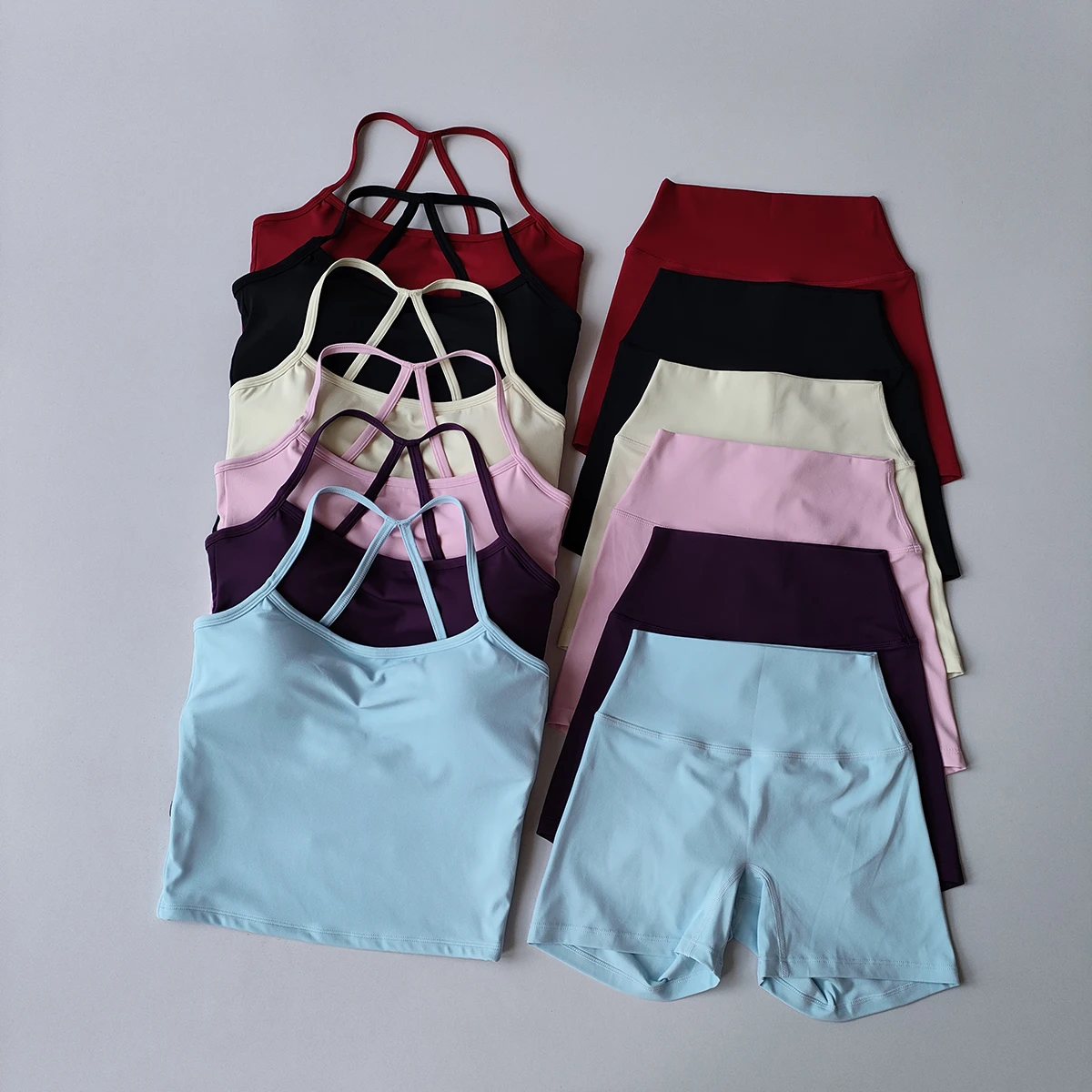 Conjunto de Top de tiras palangre, conjunto de gimnasio para Yoga, Sujetador deportivo sin espalda sin costuras, camisetas sin mangas, mallas de elevación de cadera, conjuntos de pantalones cortos de gimnasio, conjunto deportivo