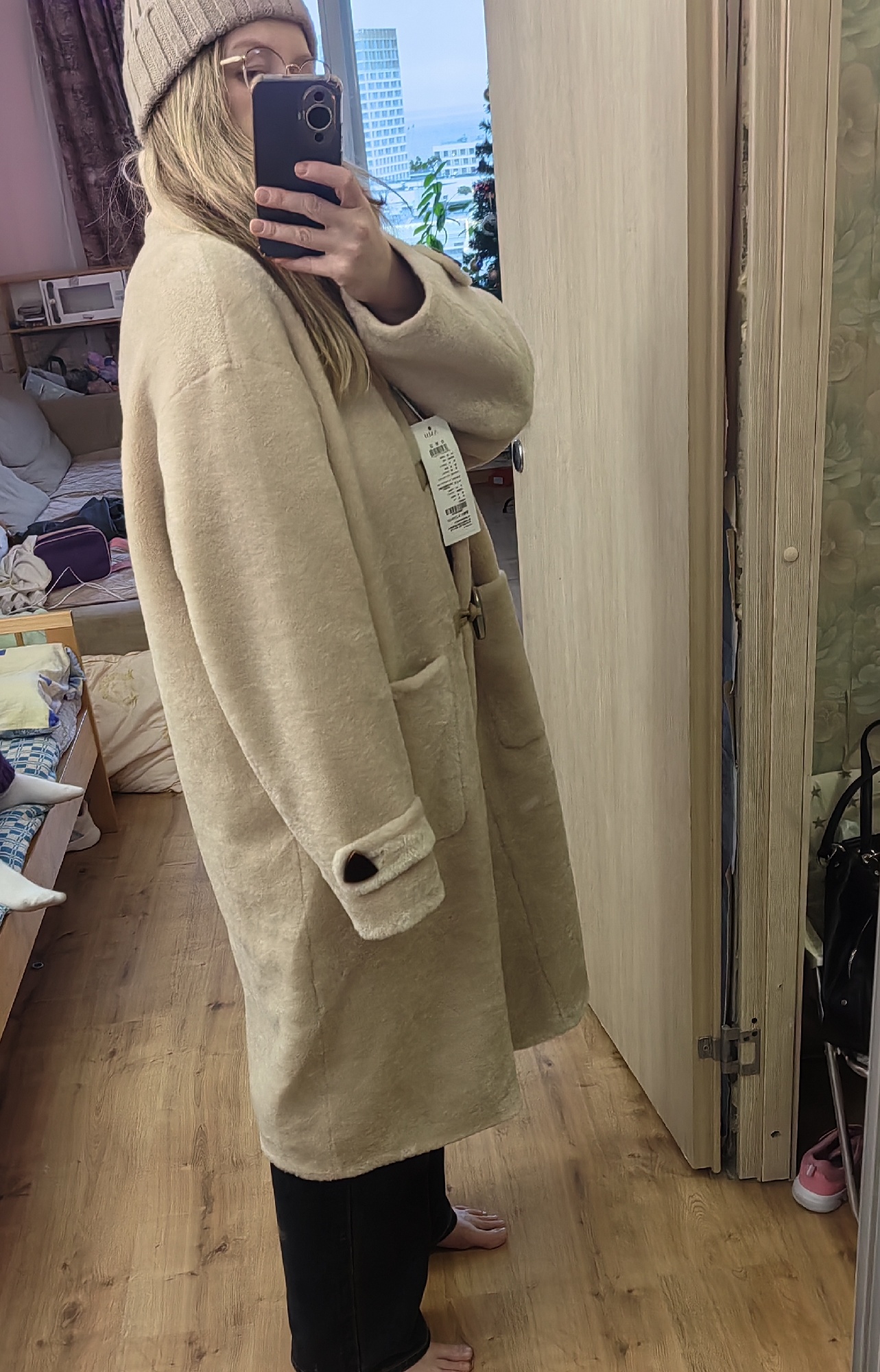 El abrigo de piel es simplemente increíble. La talla XL se ajusta perfectamente a una talla rusa 52-54. Para una altura de 172 cm, las mangas son perfectas, incluso con un poco de longitud adicional, y el largo también es adecuado.