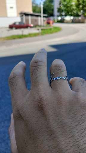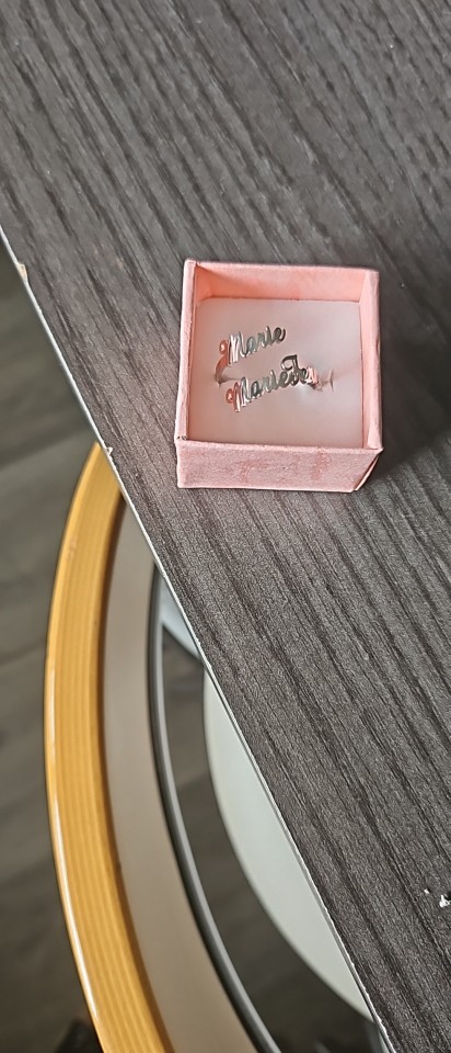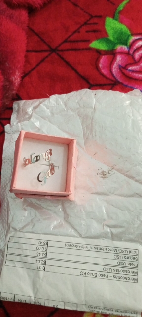 la cajita toda apachurrada y el anillo doblado pero logre enderezarlo , se ve bonito , aunque para que luzca bien deben ser nombres cortos, el envío es muy tardado