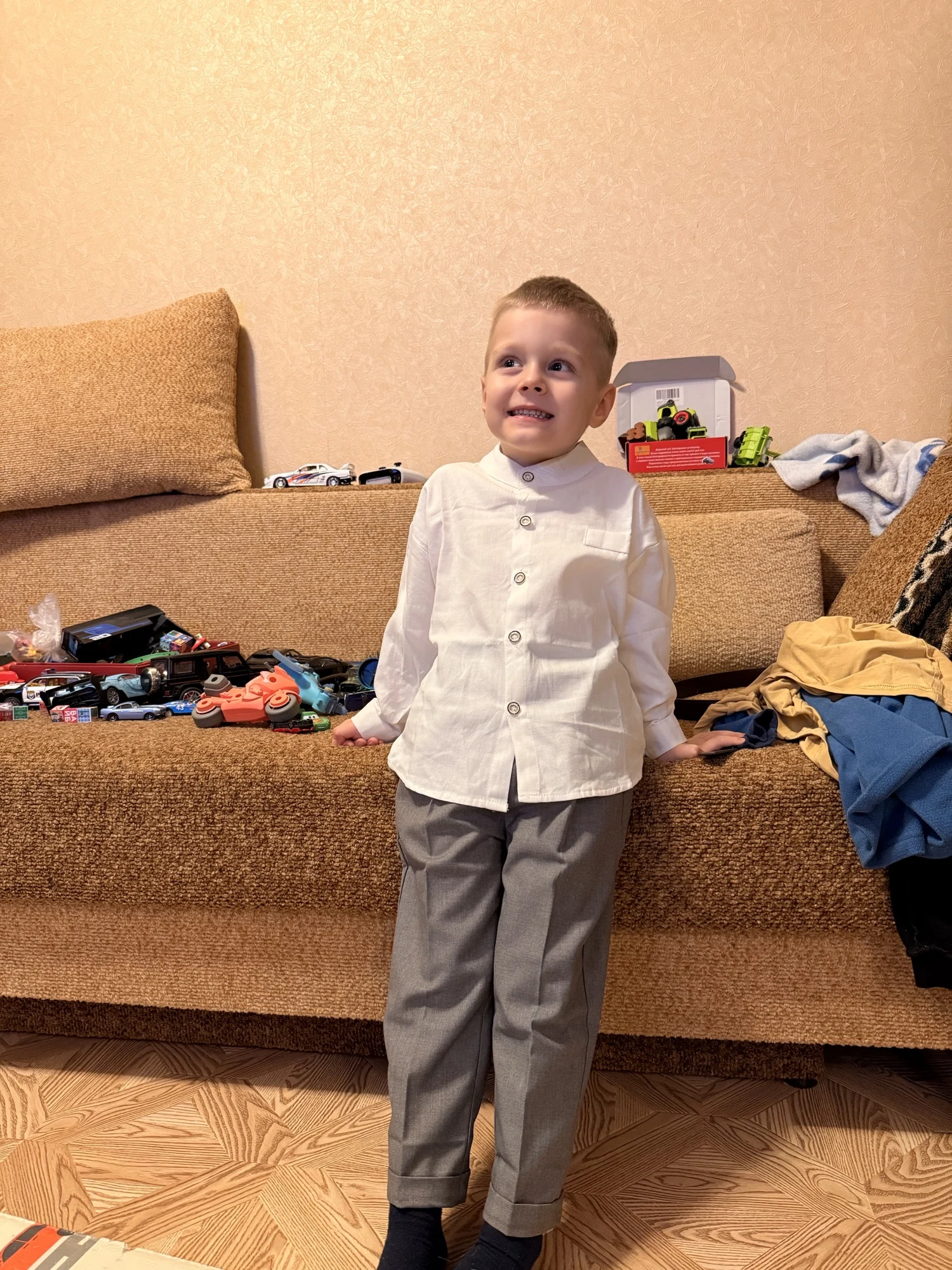 Camisa blanca gruesa, se ajusta a la talla real, pedí una talla 4T un poco más grande, que resultó ser demasiado grande para una altura de 95 cm.