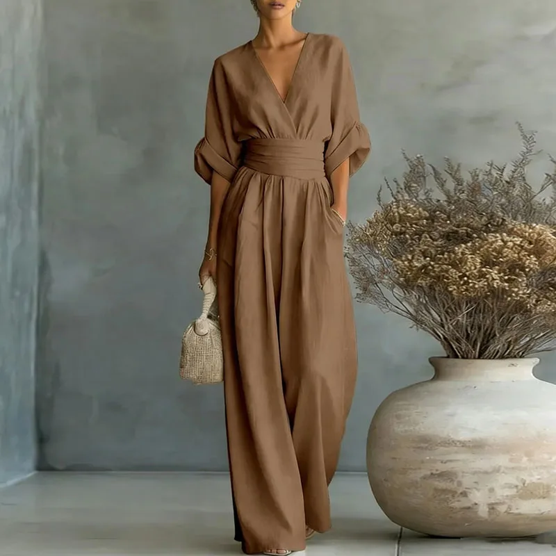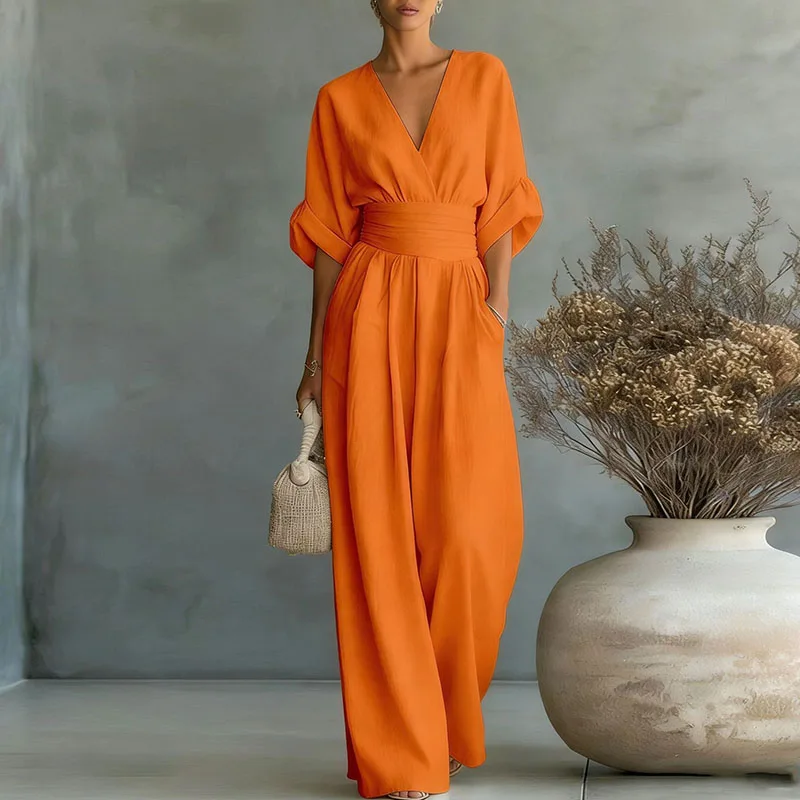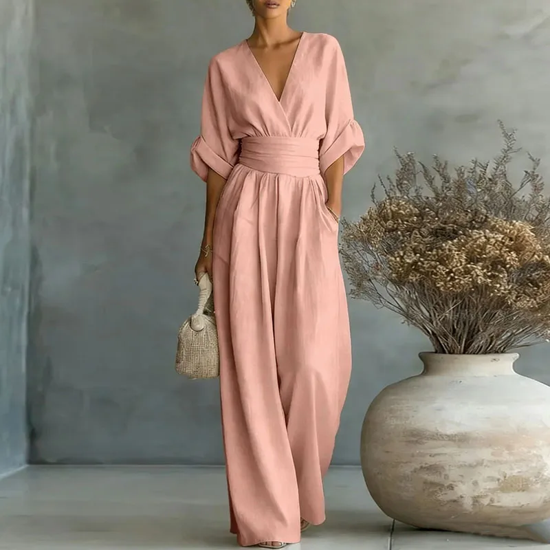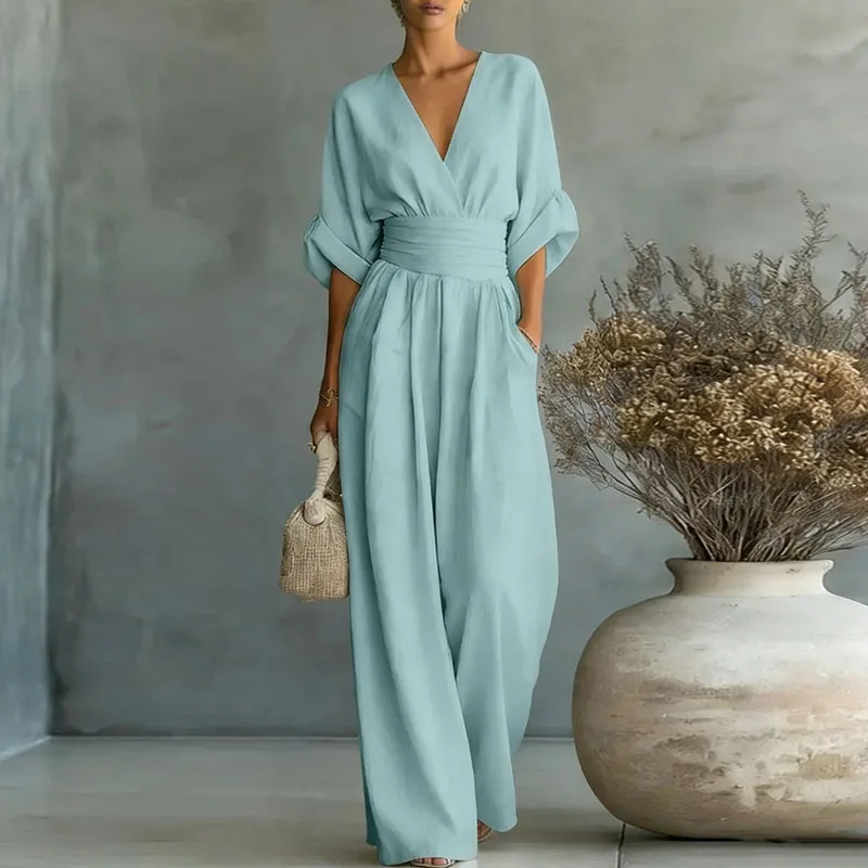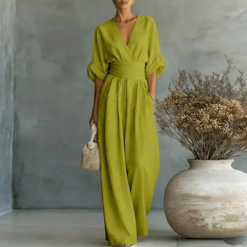 Mono de mujer estilo OL, de cintura alta, drapeado, con cuello en V, pantalón de pierna ancha, casual, de media manga, para primavera 2026