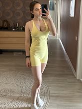 Para medidas 84-64-89, la talla M queda bien. No es ajustada, los leggings quedan un poco sueltos, pero está bien. Mejor que la talla S, que habría quedado apretada. Y la parte superior queda perfecta. Los tirantes son ajustables en la parte trasera. El color es un amarillo hermoso, suave, no brillante. ¡Lo recomiendo! La entrega a Ucrania tardó 13 días.