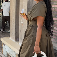 ¡Qué vestido tan precioso! El tono oliva sigue siendo tendencia y el diseño general es clásico pero moderno. Ideal para un día en la ciudad.