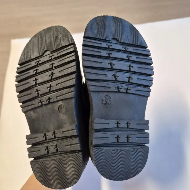 Estoy muy satisfecho con las botas. El vendedor insertó una almohadilla en el empeine para ayudar a mantener su forma. Las botas son suaves y cómodas. Parecen de cuero. Compré una talla 35 para un pie de 20 cm de largo (quedó un poco de espacio adicional).