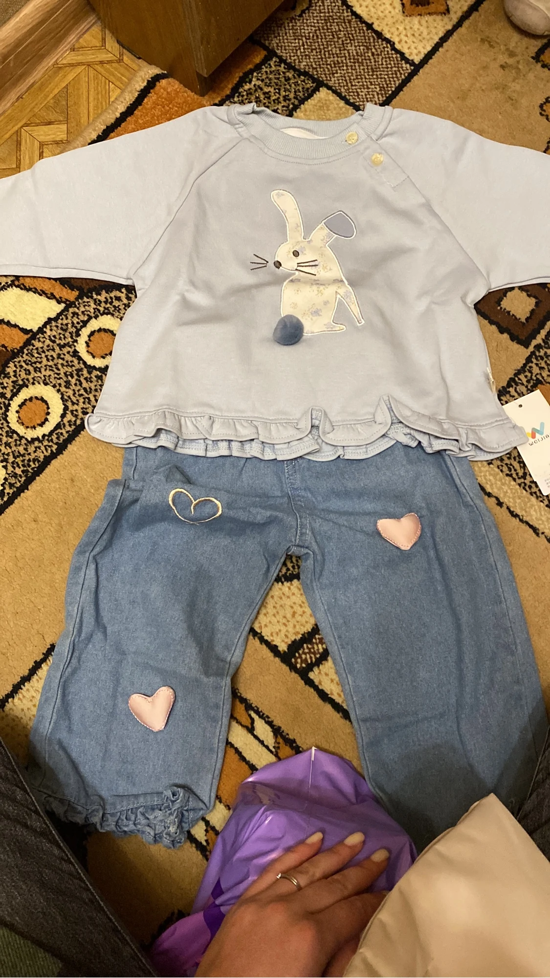 El material de los jeans no es muy grueso, pero es lindo y cómodo para mi hija, holgado y suave. No parece muy resistente, pero también es fiel a la talla.