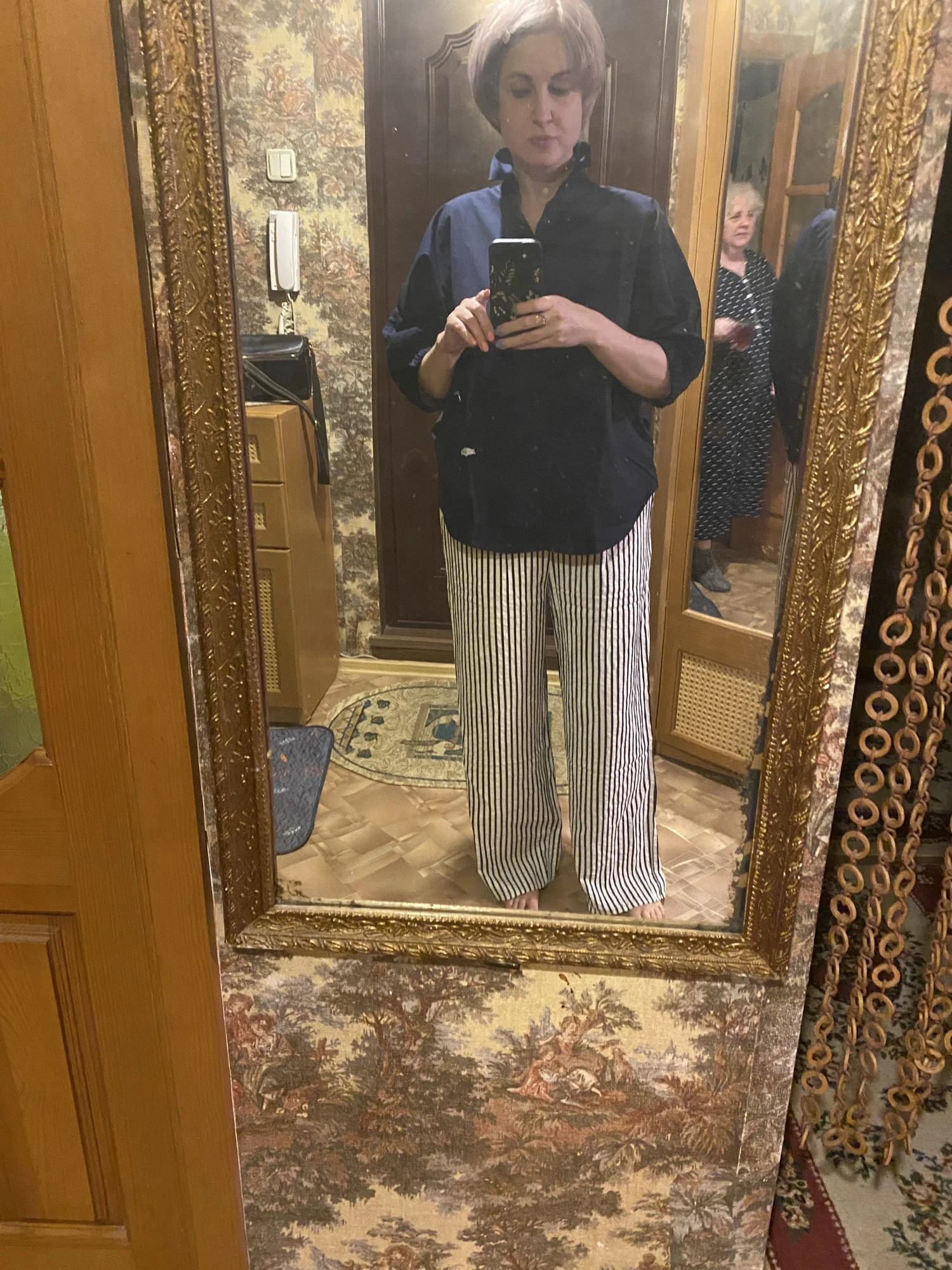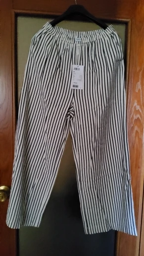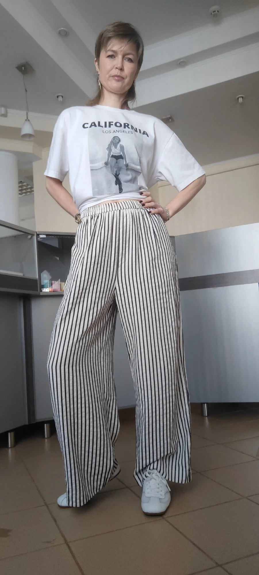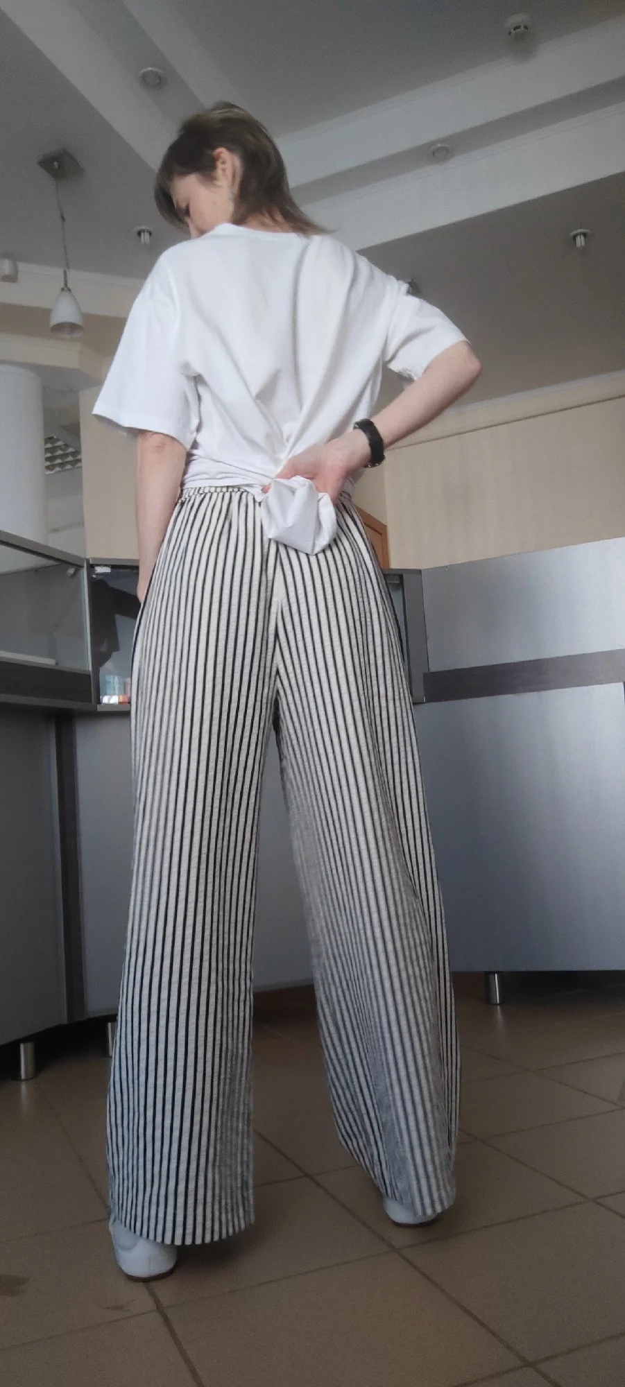 ¡Pantalones increíbles! Tela ligera y arrugada, se ajusta perfectamente a una persona de 165 cm de altura y complexión delgada, adecuados para tallas 48-50. Perfectos para el verano, brillantes y no se arrugan fácilmente, no necesitan planchado, ideales para vacaciones, hechos de viscosa. El ancho es perfecto: no son holgados y disimulan imperfecciones.