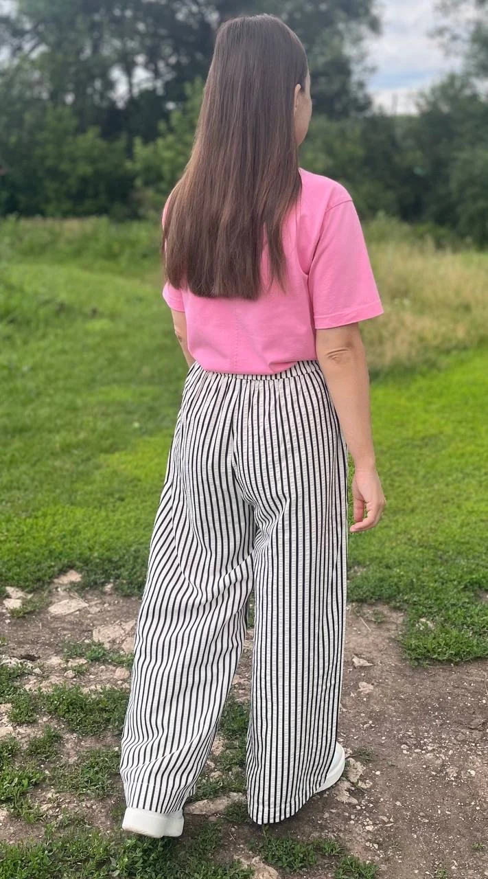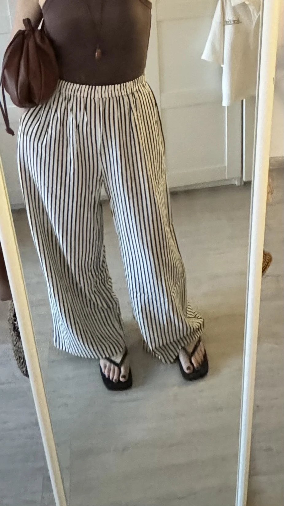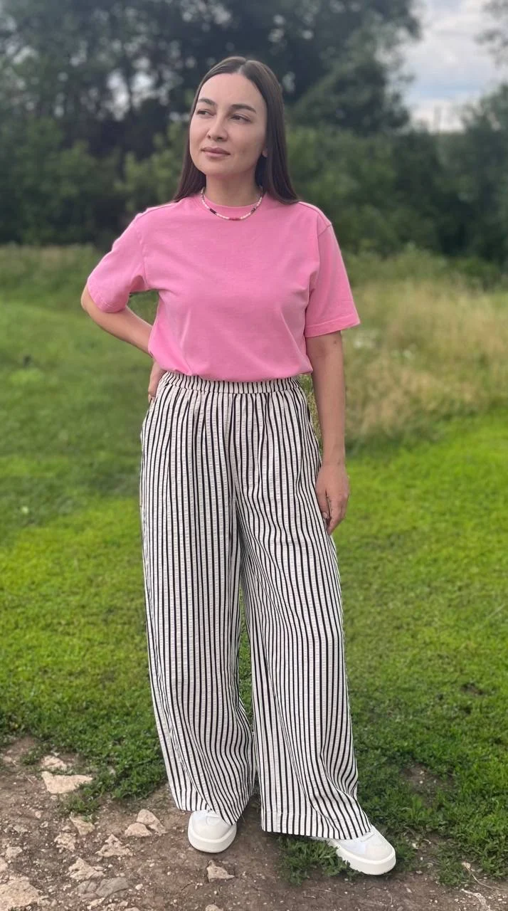 Más reseñas en el canal de Telegram. Probablemente sean algunos de mis pantalones más exitosos para el verano. Composición: 56,9% poliéster, 43,1% viscosa. La tela es delgada pero no transparente, con una textura ligeramente arrugada—gracias a esto, apenas se arrugan (incluso después de un avión y un tren!). Como se muestra en la foto - sin planchar. La talla S se ajusta a parámetros 62/92, pero también se adapta a caderas y cinturas más grandes; el elástico se estira bien, proporcionando un ajuste cómodo. Medidas reales (Talla S): ▫️ Longitud: 100 cm ▫️ Medida de cadera: 111 ▫️ Cintura: 64 Color - beige-azul: se ve más suave e interesante que la clásica franja negra y blanca. Visualmente alargan la silueta mientras son sueltos en las piernas, no ajustados. Hay dos bolsillos convenientes en el costado. Muy suave y agradable al tacto - ideal para un verano fresco o para moverse: en un viaje o para una caminata. Combinan tanto con camisetas como con chaquetas cortas. La calidad supera las expectativas por su precio. Definitivamente lo recomiendo. 💯