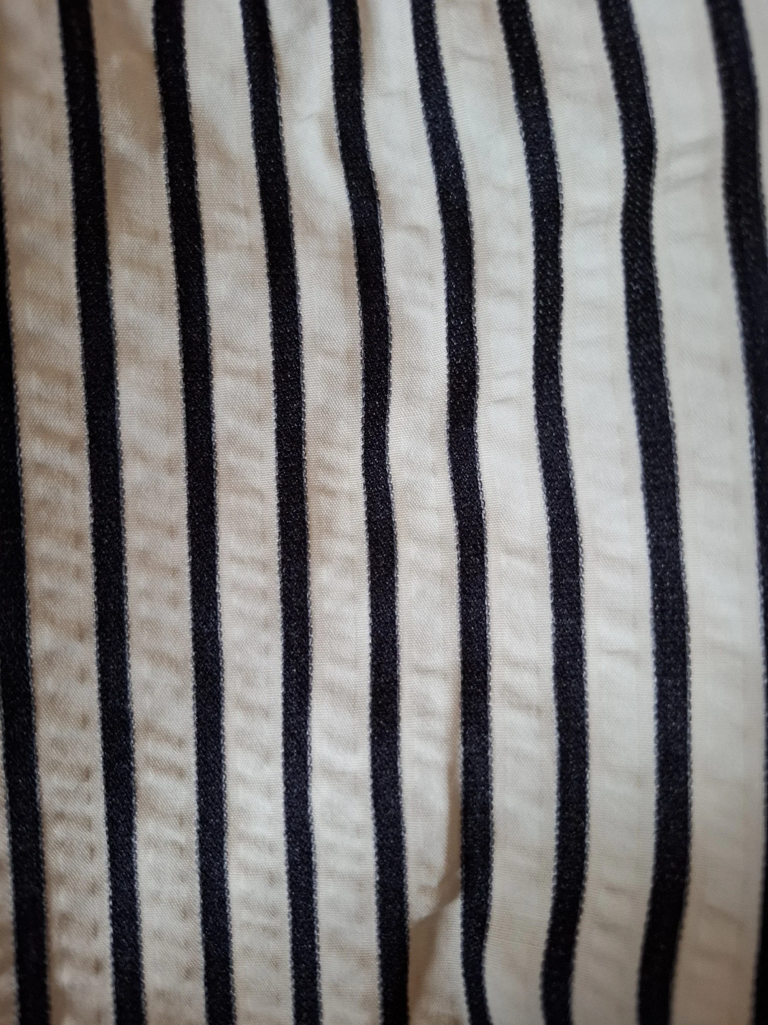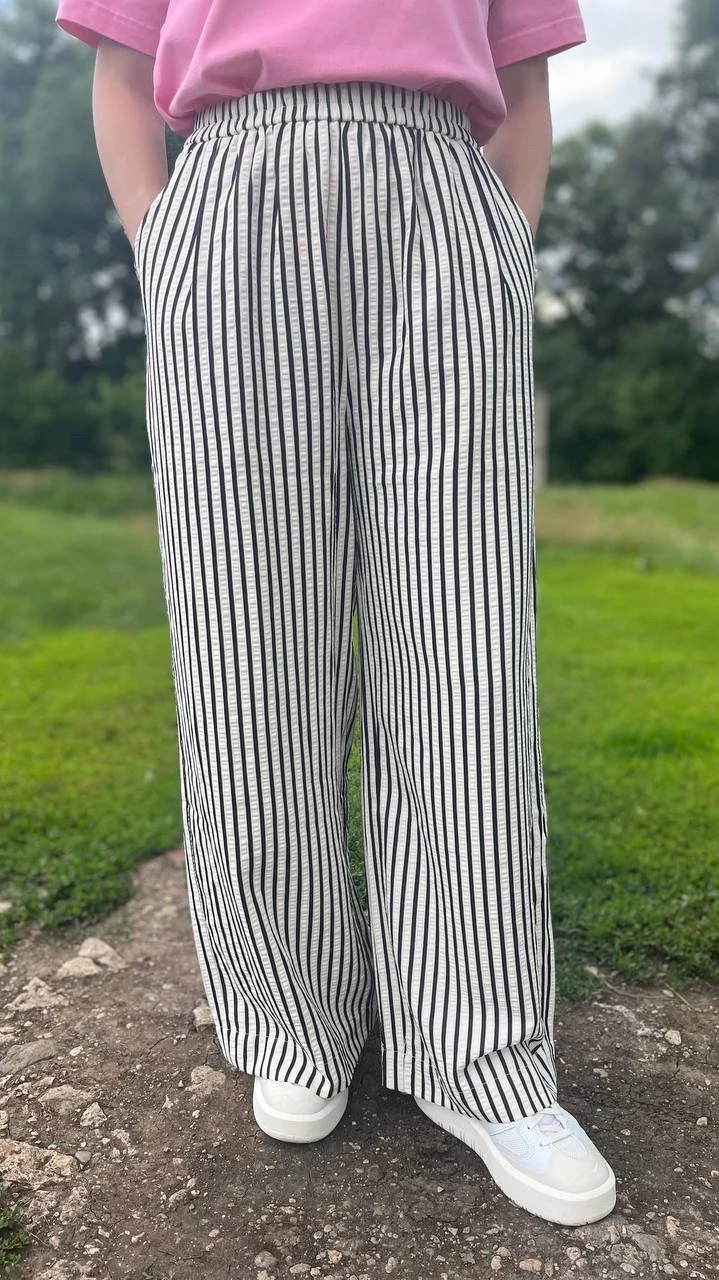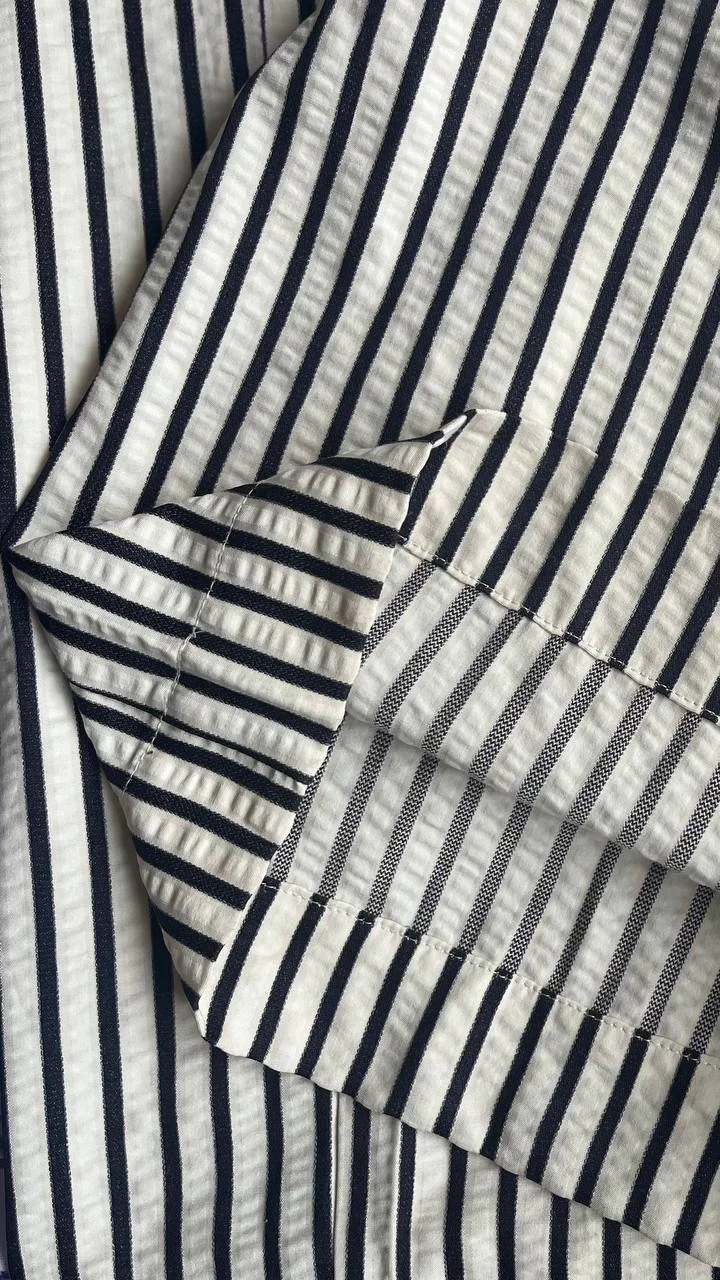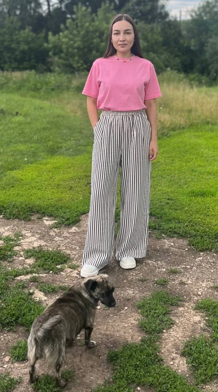Más reseñas en el canal de Telegram. Probablemente sean algunos de mis pantalones más exitosos para el verano. Composición: 56,9% poliéster, 43,1% viscosa. La tela es delgada pero no transparente, con una textura ligeramente arrugada—gracias a esto, apenas se arrugan (incluso después de un avión y un tren!). Como se muestra en la foto - sin planchar. La talla S se ajusta a parámetros 62/92, pero también se adapta a caderas y cinturas más grandes; el elástico se estira bien, proporcionando un ajuste cómodo. Medidas reales (Talla S): ▫️ Longitud: 100 cm ▫️ Medida de cadera: 111 ▫️ Cintura: 64 Color - beige-azul: se ve más suave e interesante que la clásica franja negra y blanca. Visualmente alargan la silueta mientras son sueltos en las piernas, no ajustados. Hay dos bolsillos convenientes en el costado. Muy suave y agradable al tacto - ideal para un verano fresco o para moverse: en un viaje o para una caminata. Combinan tanto con camisetas como con chaquetas cortas. La calidad supera las expectativas por su precio. Definitivamente lo recomiendo. 💯