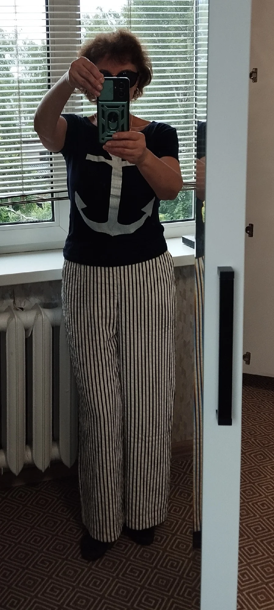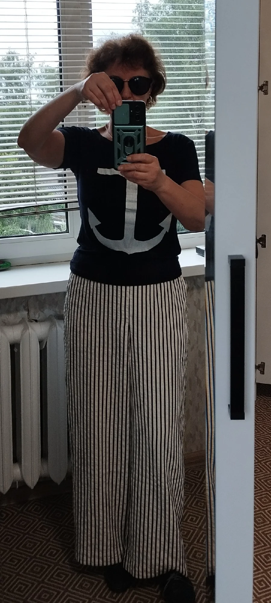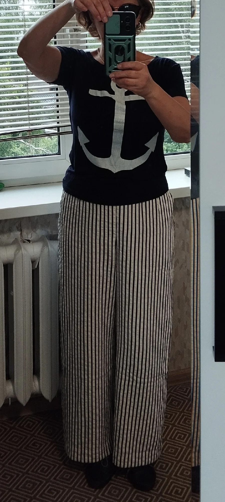 Pantalones de verano cómodos, tela con una textura interesante, que se combinan fácilmente tanto con artículos negros y blancos como de colores. Para parámetros de 80 a 103, tomé XL, los pantalones quedan muy cómodos y holgados, el largo es perfecto pero para 160cm con un ligero tacón/plataforma.