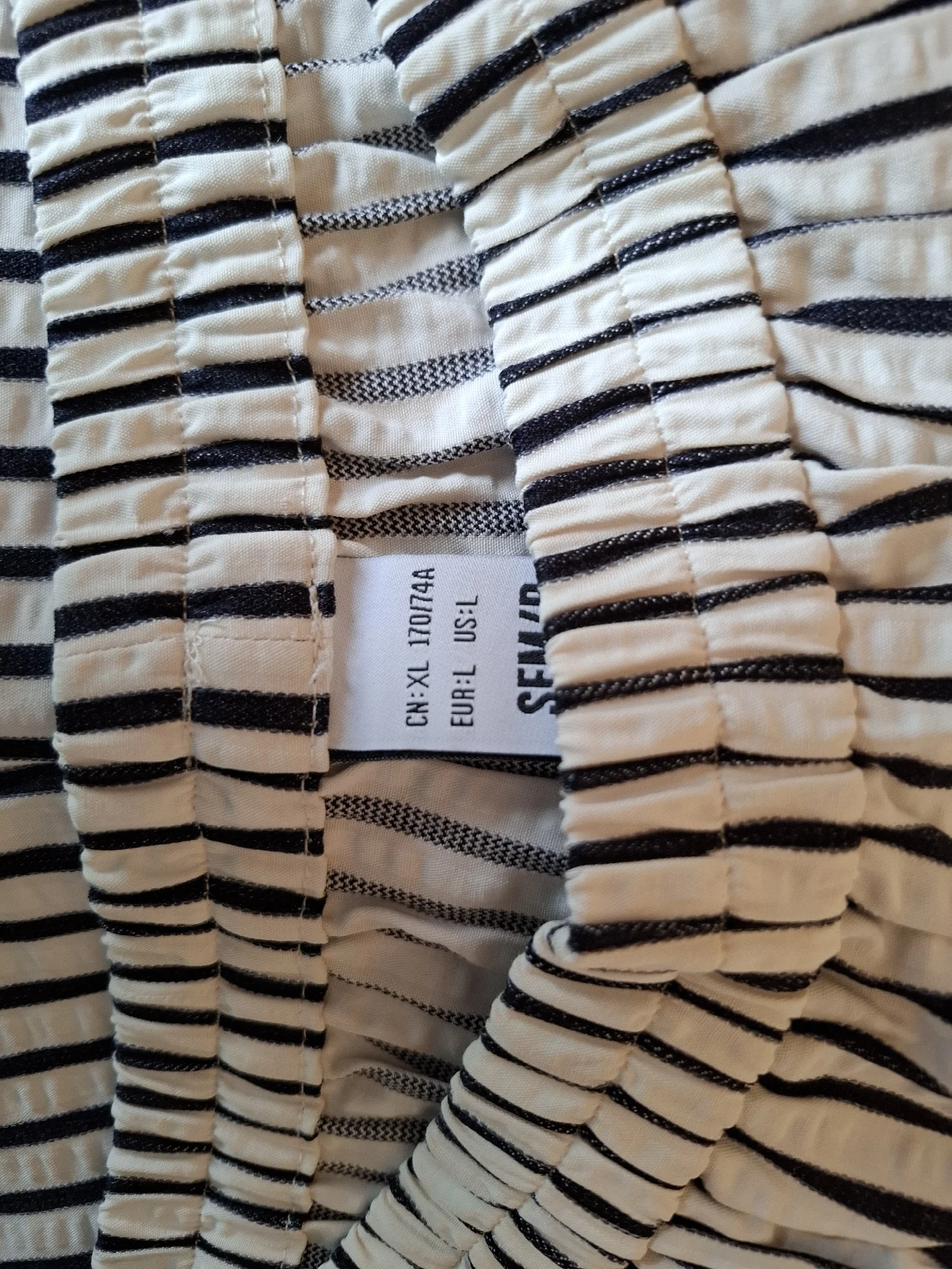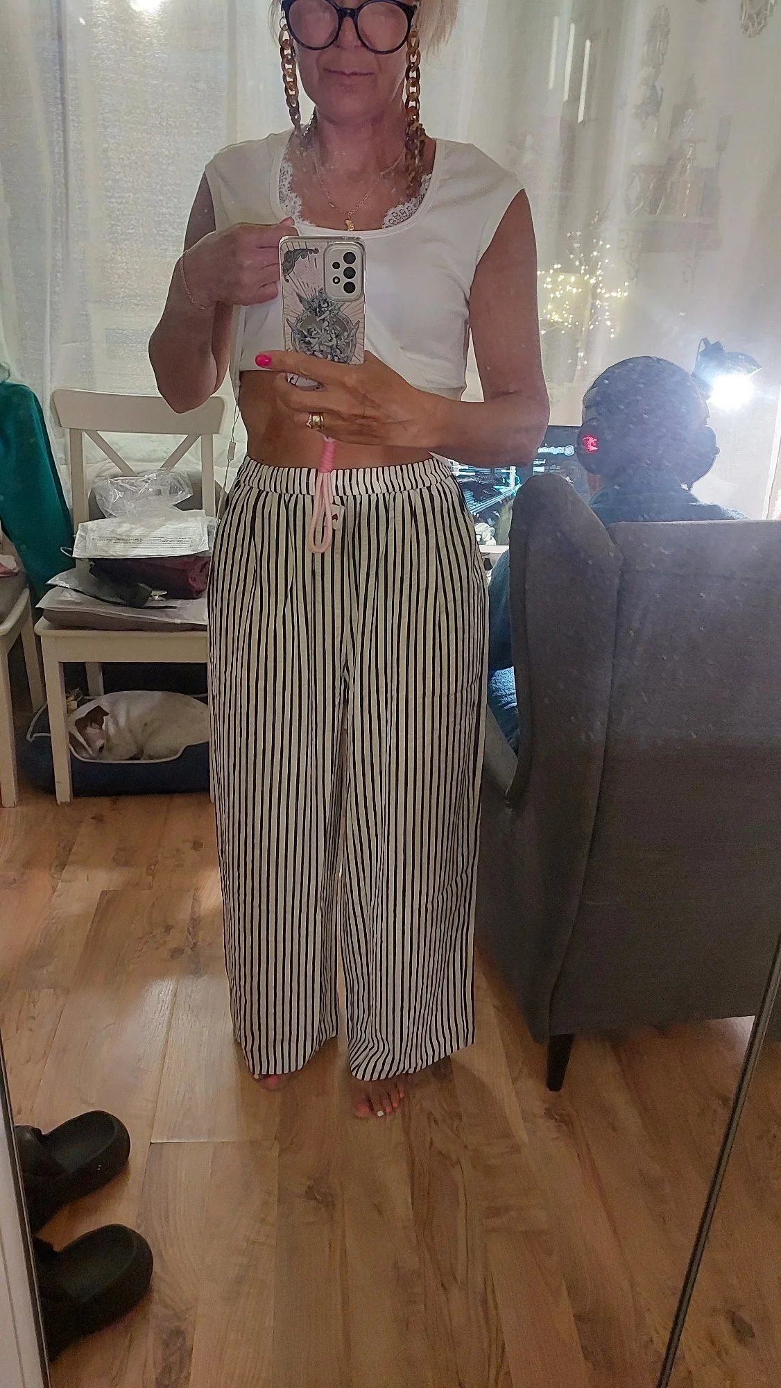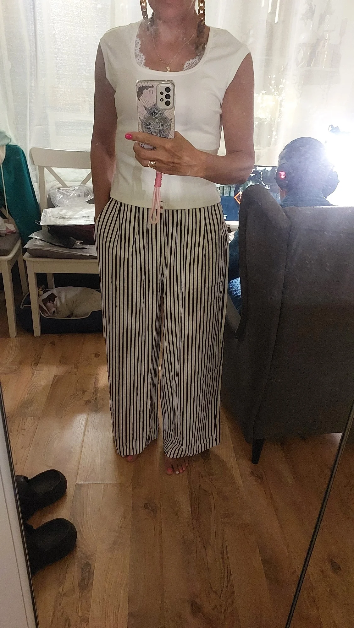 Pantalones de verano cómodos, tela con una textura interesante, que se combinan fácilmente tanto con artículos negros y blancos como de colores. Para parámetros de 80 a 103, tomé XL, los pantalones quedan muy cómodos y holgados, el largo es perfecto pero para 160cm con un ligero tacón/plataforma.