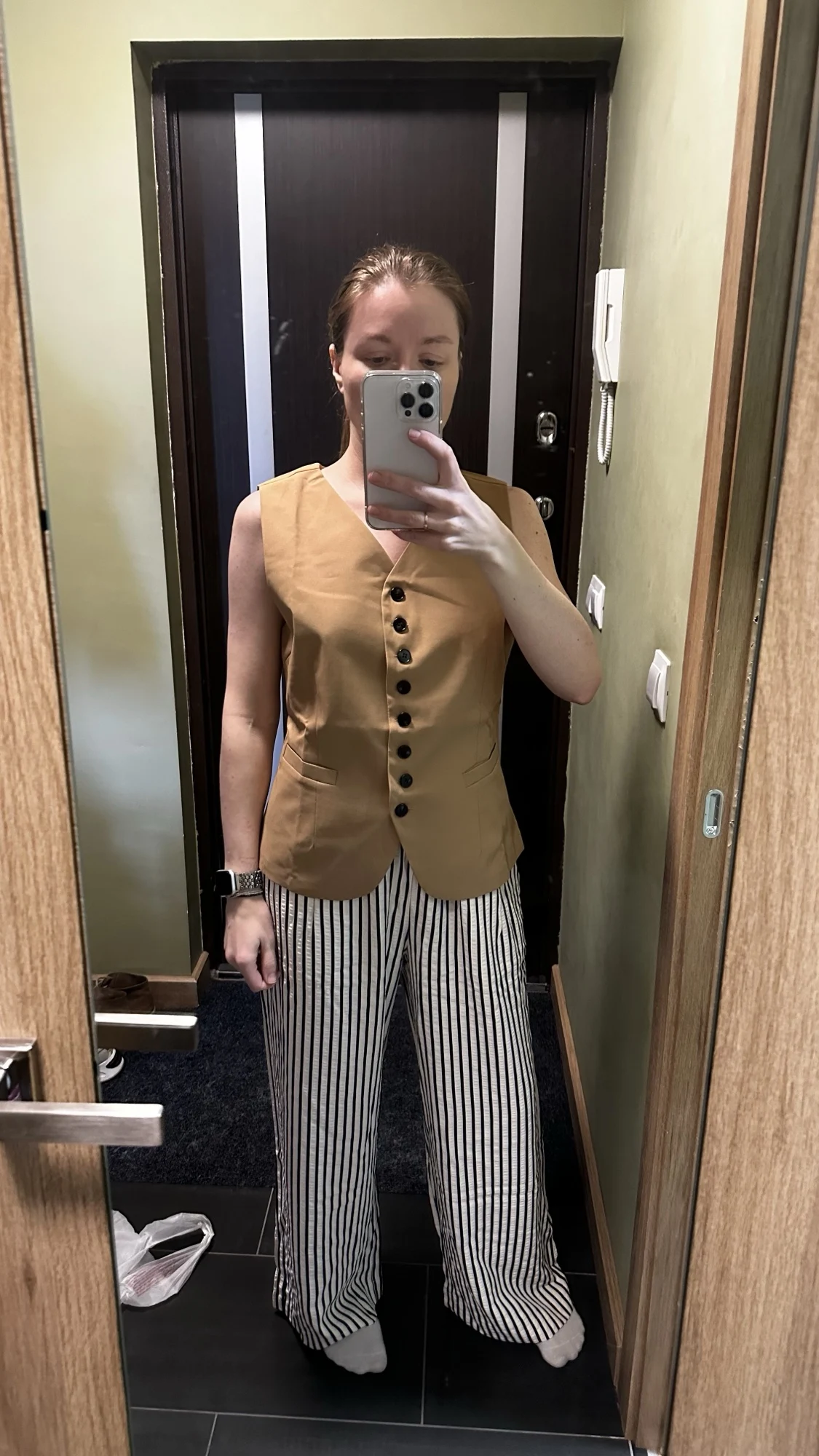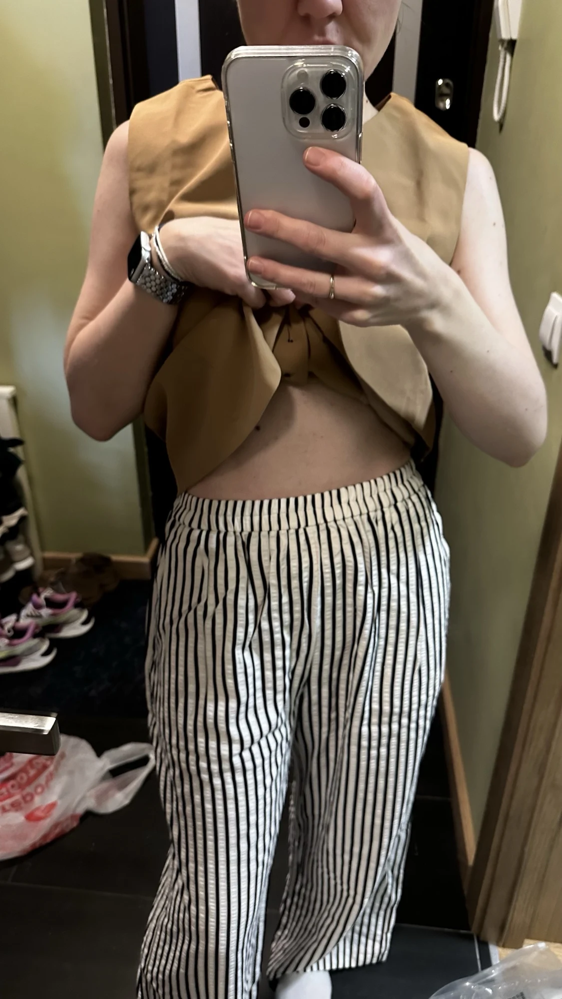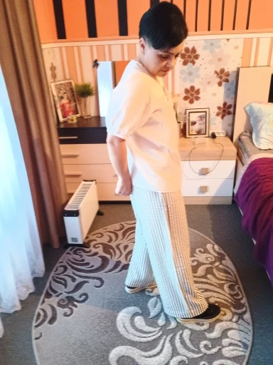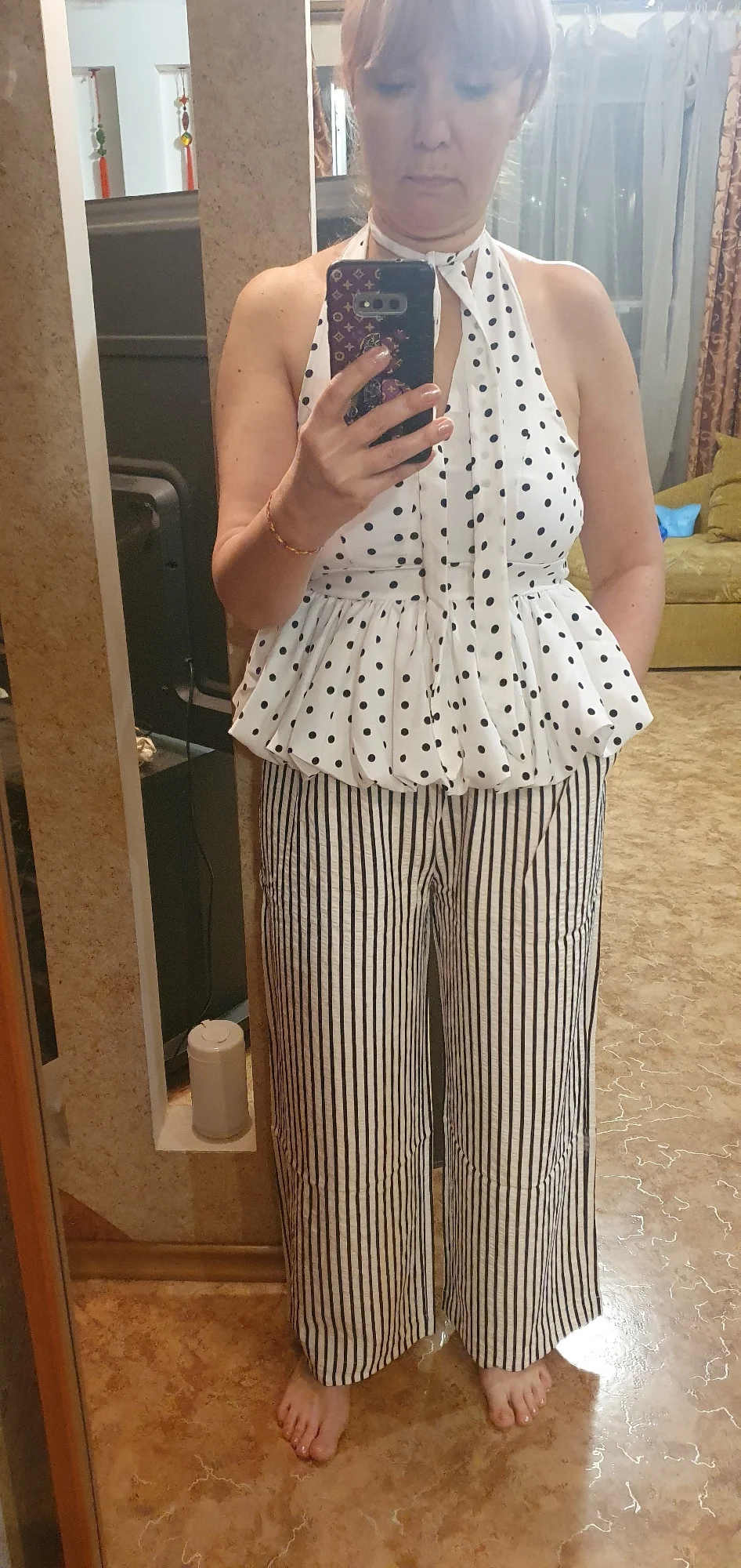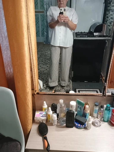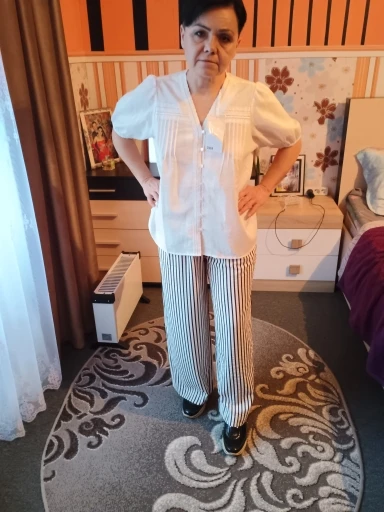 Los compré basándome en las reseñas, y los pantalones son realmente geniales. Para una altura de 156 cm, son lo suficientemente largos y se ajustan perfectamente a una cintura de 90 cm y caderas de 104 cm, sin exceso. La tela es agradable, ligeramente arrugada, por lo que no tendré que plancharla. La franja blanca en realidad no es blanca, sino beige claro, lo cual se ve genial con una blusa roja.