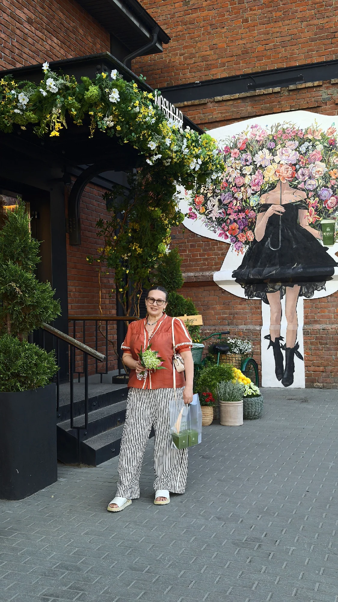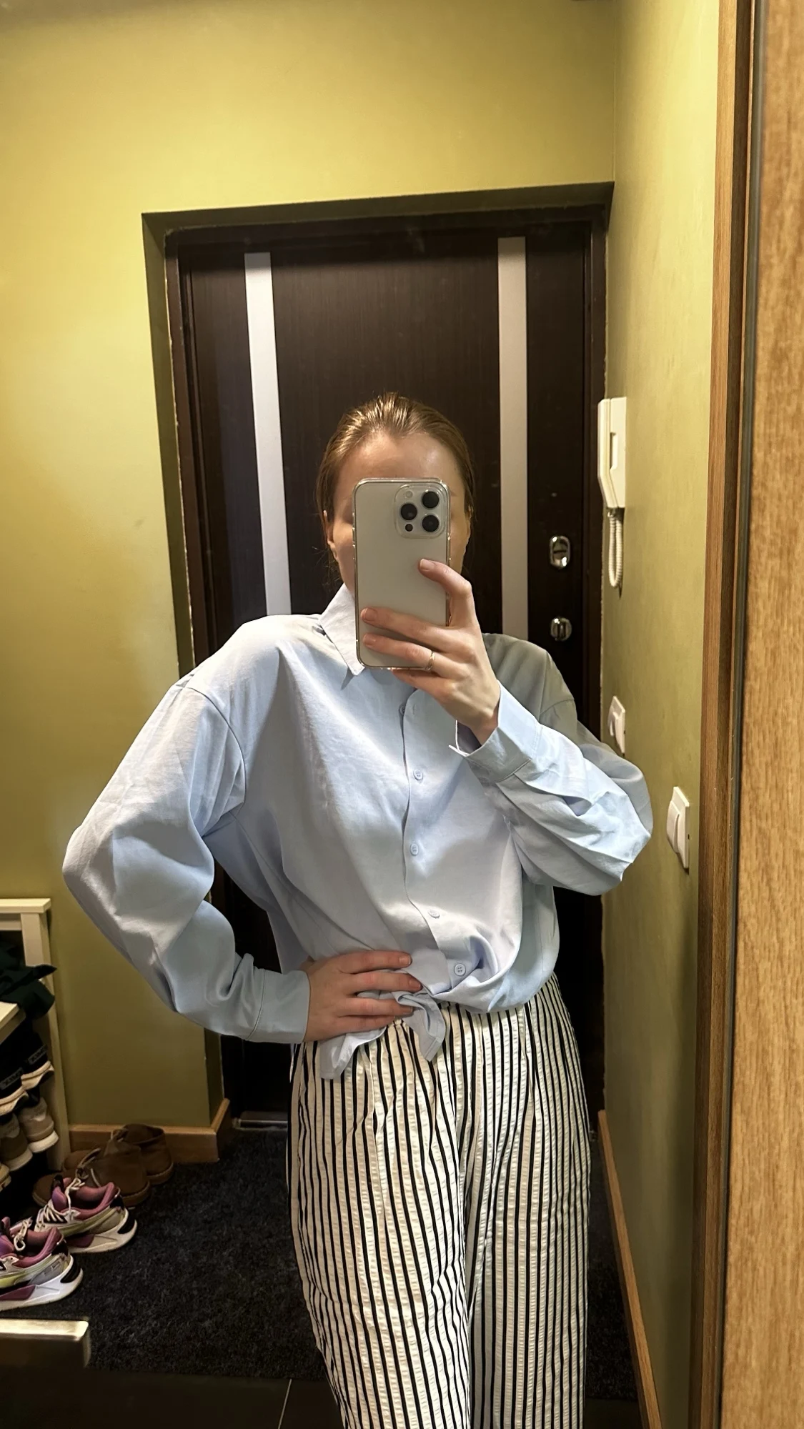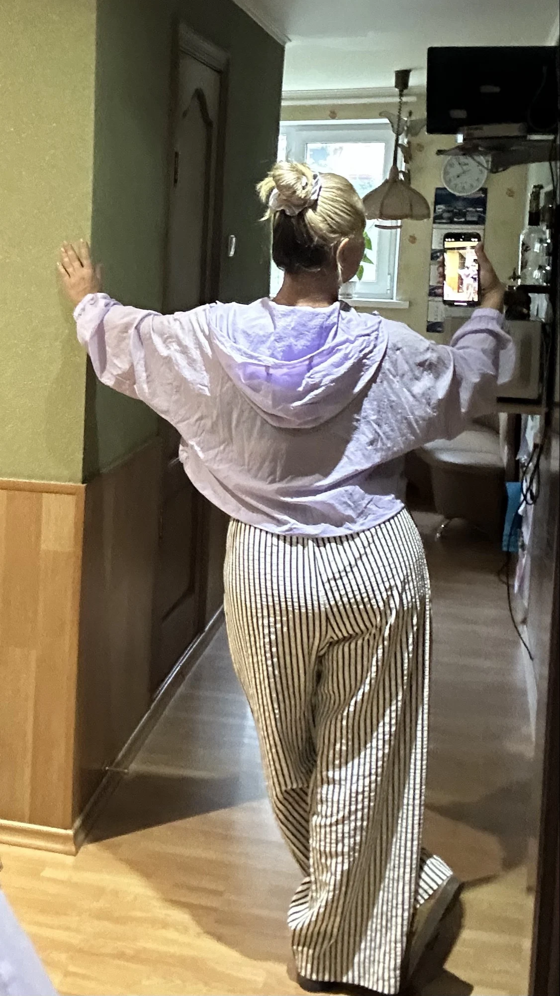 Los compré basándome en las reseñas, y los pantalones son realmente geniales. Para una altura de 156 cm, son lo suficientemente largos y se ajustan perfectamente a una cintura de 90 cm y caderas de 104 cm, sin exceso. La tela es agradable, ligeramente arrugada, por lo que no tendré que plancharla. La franja blanca en realidad no es blanca, sino beige claro, lo cual se ve genial con una blusa roja.