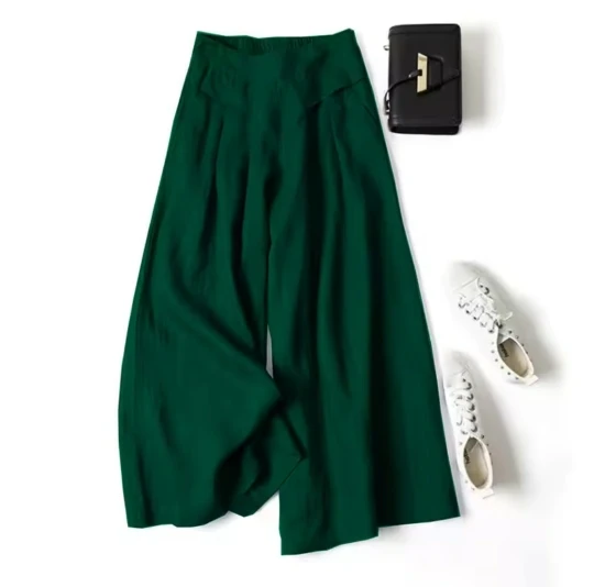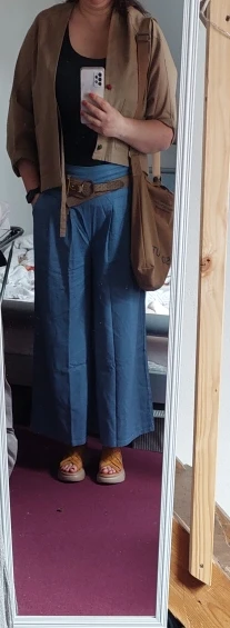 Hermosos pantalones acampanados de verano, pantalones cortos de cintura alta hechos de tela natural, color precioso, azul atenuado, la talla coincide con la descripción. Encajan perfectamente en la figura. Hay una banda elástica en la parte de atrás que ajusta el ajuste, ¡así que estos pantalones te permiten perder y ganar peso dentro de la razón! De hecho, son exactamente iguales a la foto del vendedor.