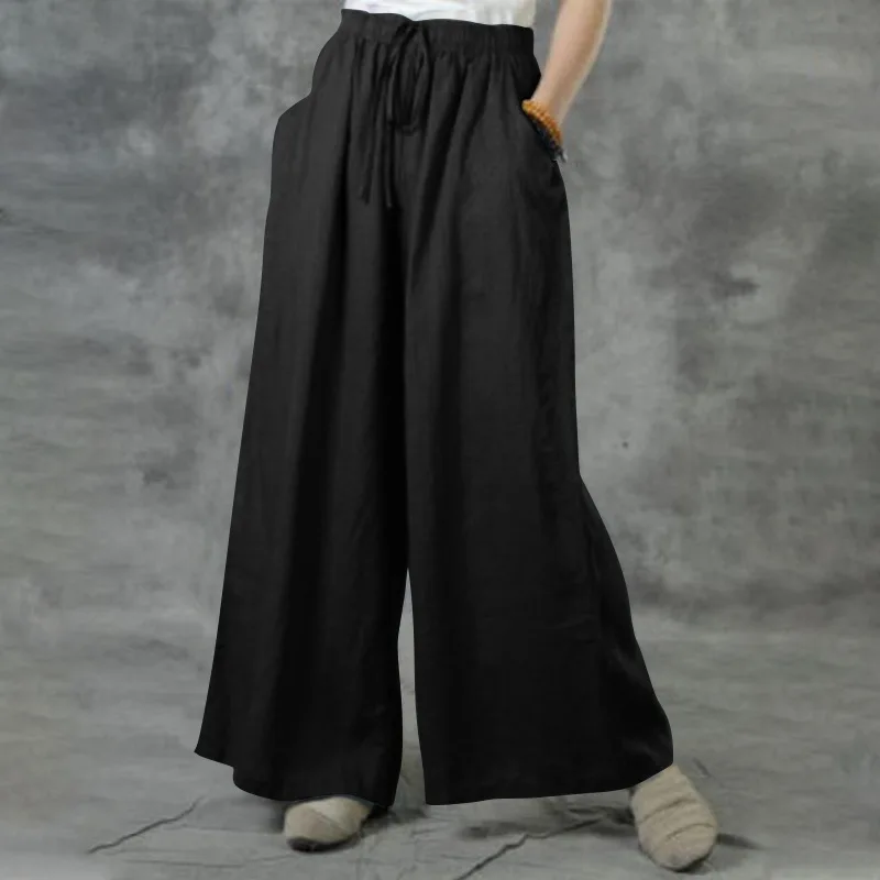 Pantalones holgados de pierna ancha para mujer, pantalón informal de lino y algodón, cintura elástica, Color sólido, con cordón, novedad de verano