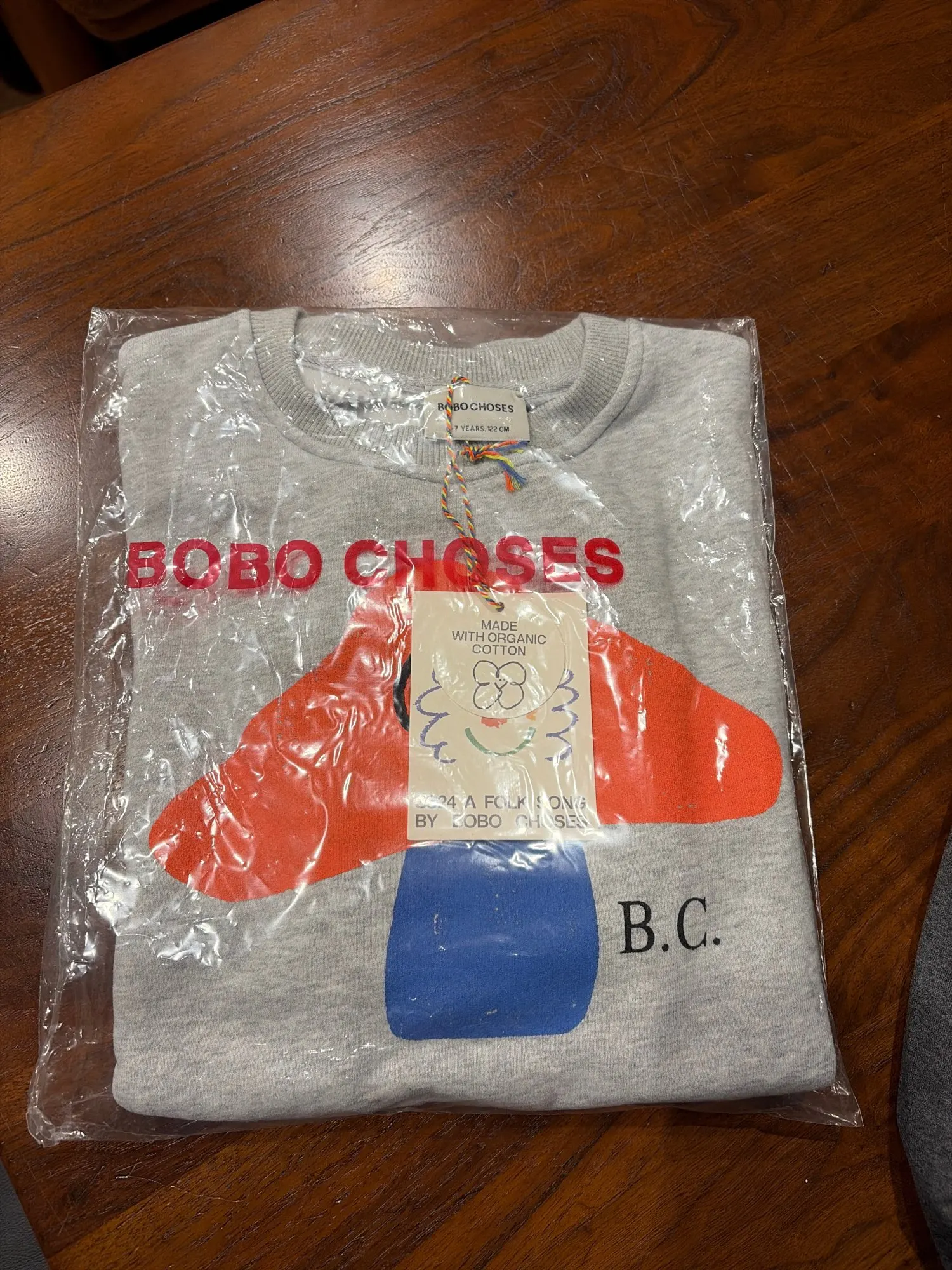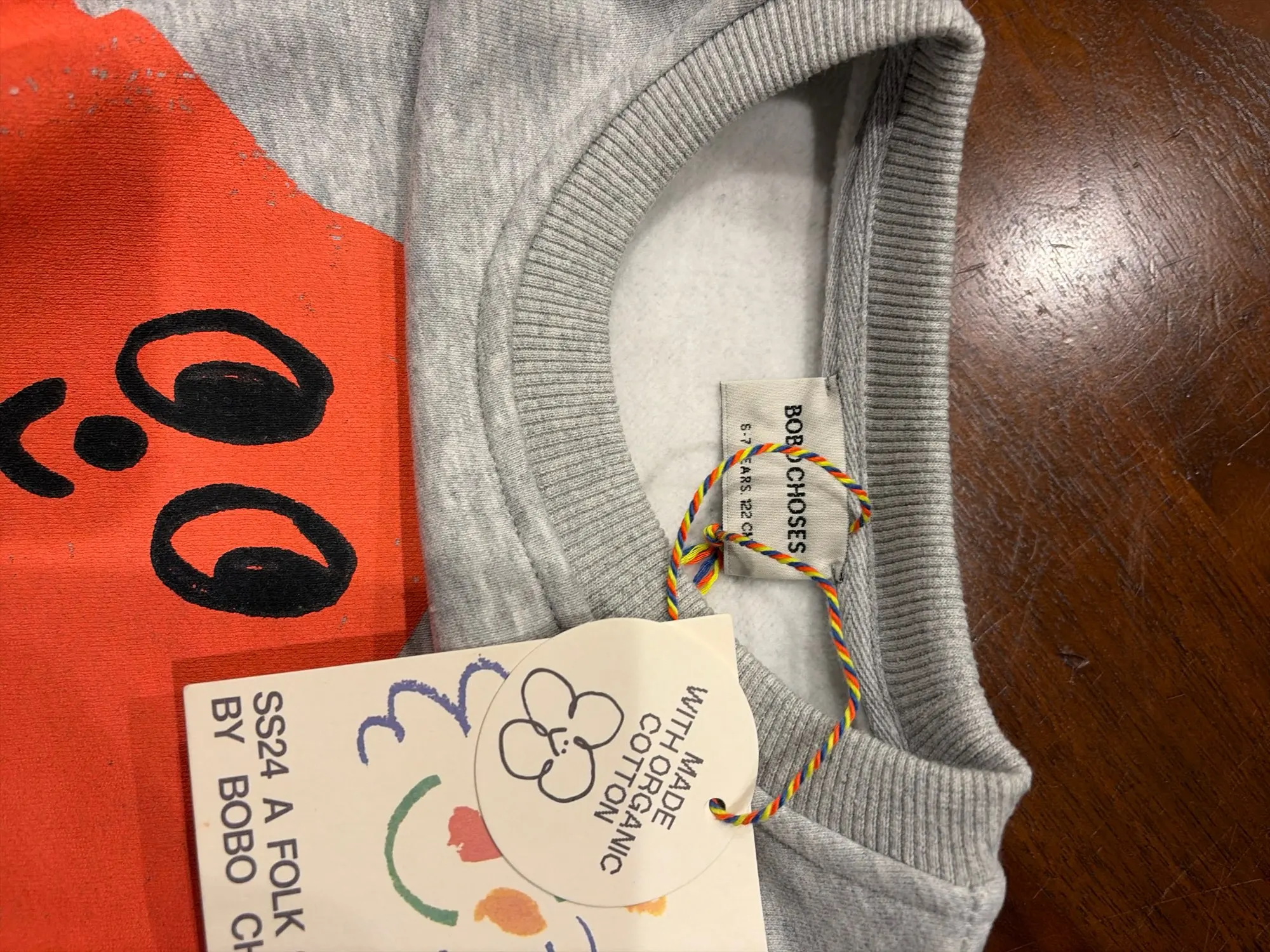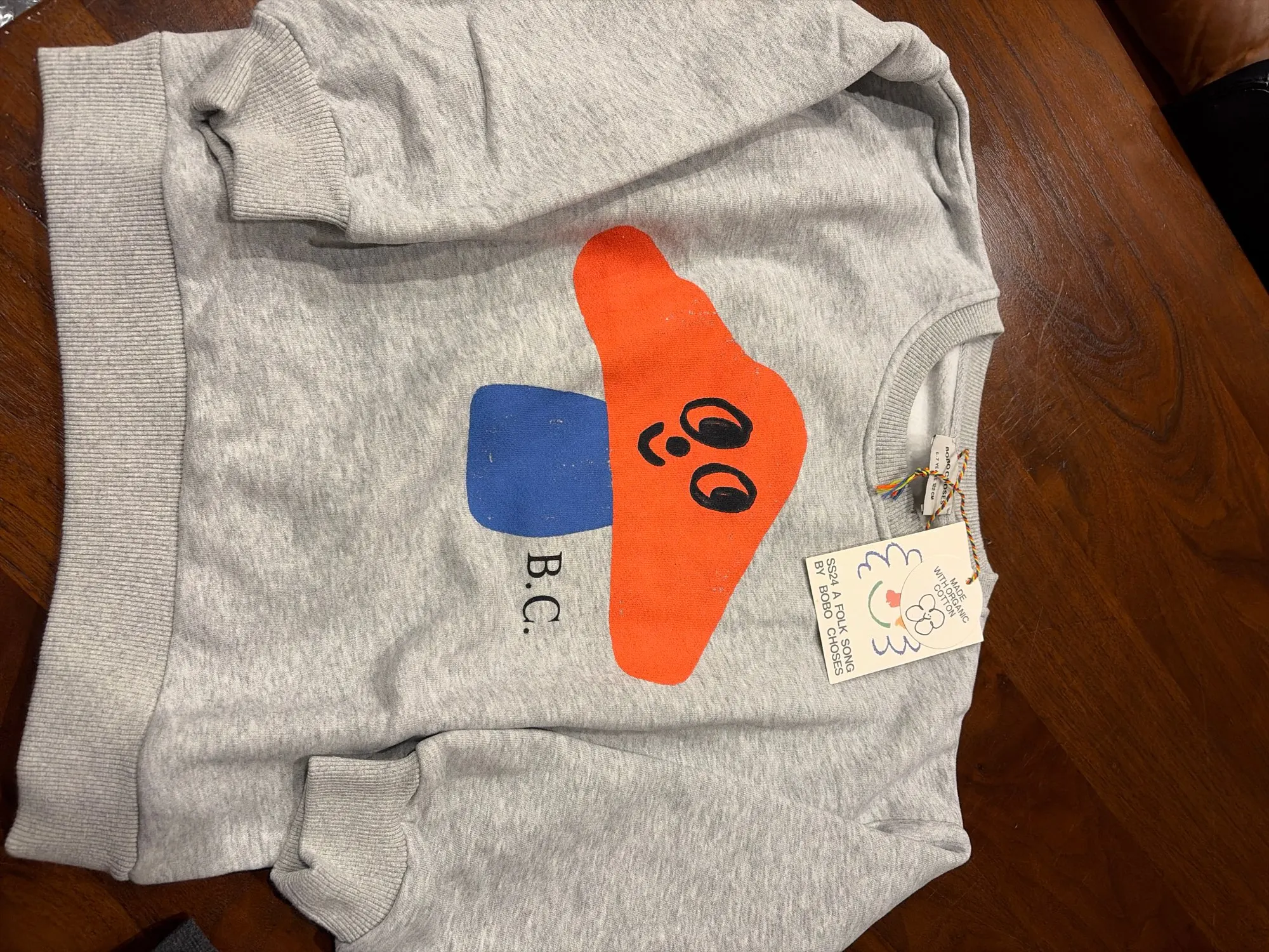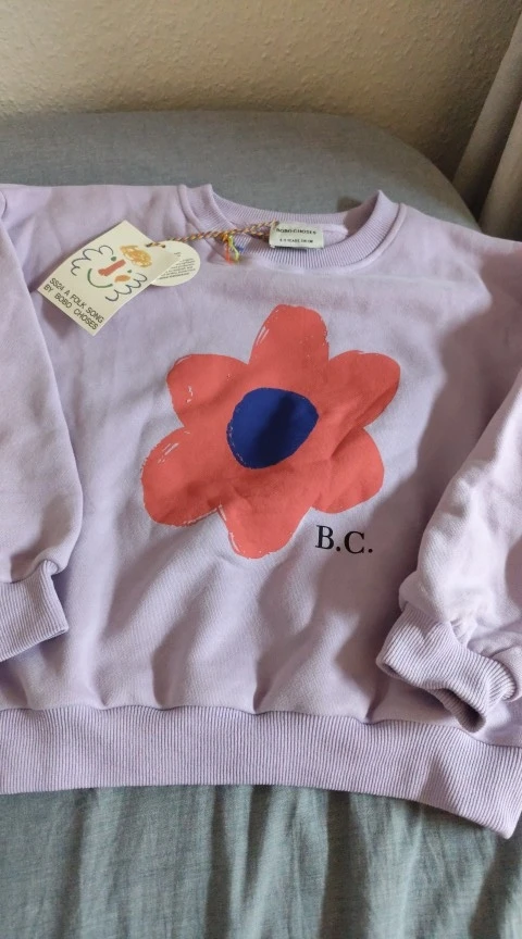 Estoy muy satisfecho. La composición del tejido es 100% algodón. El tejido es grueso y suave, con empaque y etiquetas de la marca. La impresión no se desvanece. Me encanta. Los Bobo Choses originales cuestan 5 veces más.