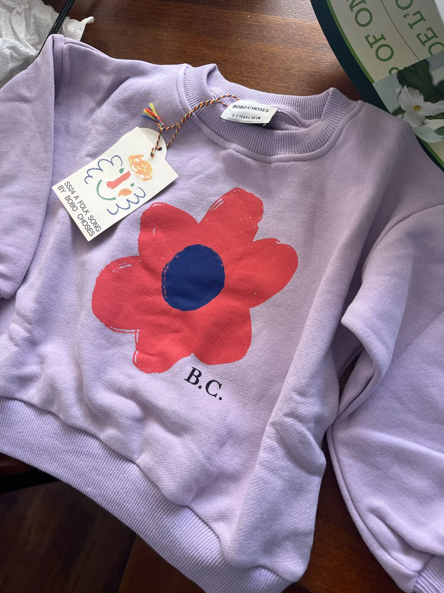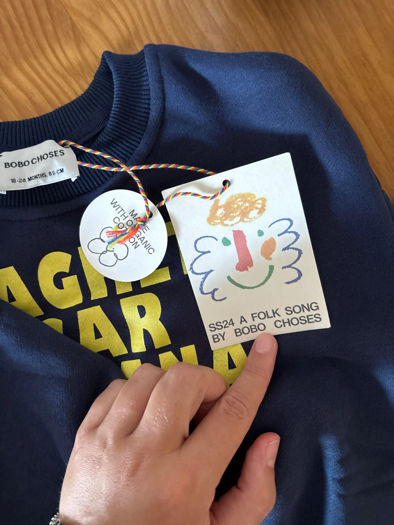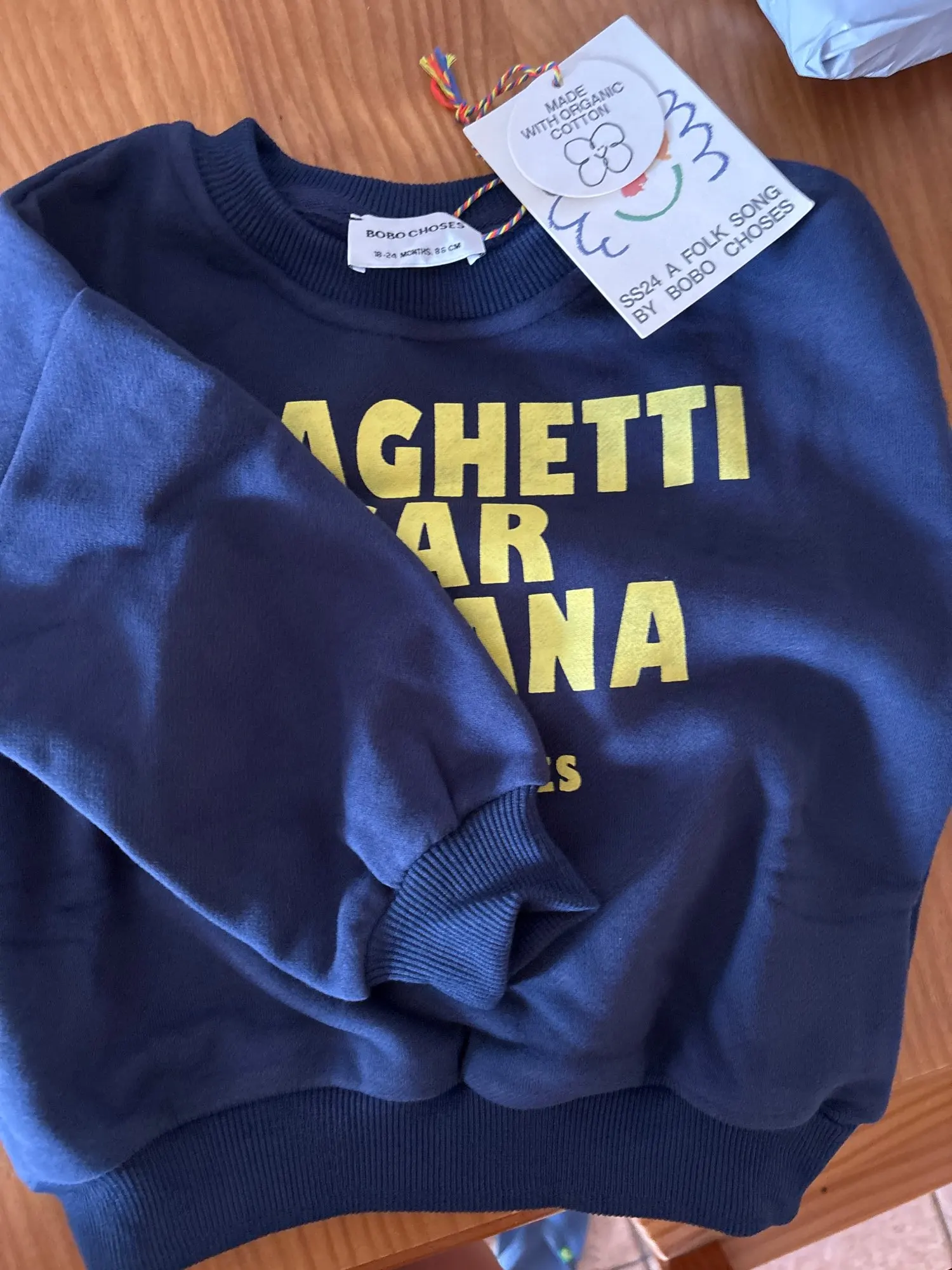 Estoy muy satisfecho. La composición del tejido es 100% algodón. El tejido es grueso y suave, con empaque y etiquetas de la marca. La impresión no se desvanece. Me encanta. Los Bobo Choses originales cuestan 5 veces más.