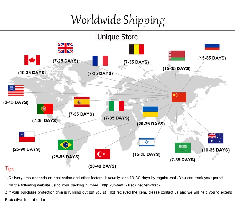 Packages from our warehouse in China will be shipped by ePacket or EMS depending on the weight and size of the product. Packages shipped from our US warehouse are shipped through USPS.