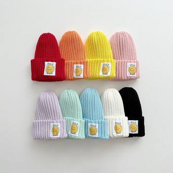 Gorros de punto de Color caramelo para niñas y bebés, sombrero de lana elástica con parche de cara sonriente, de algodón, novedad de Boutique