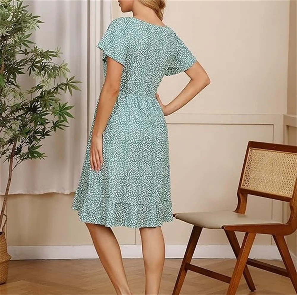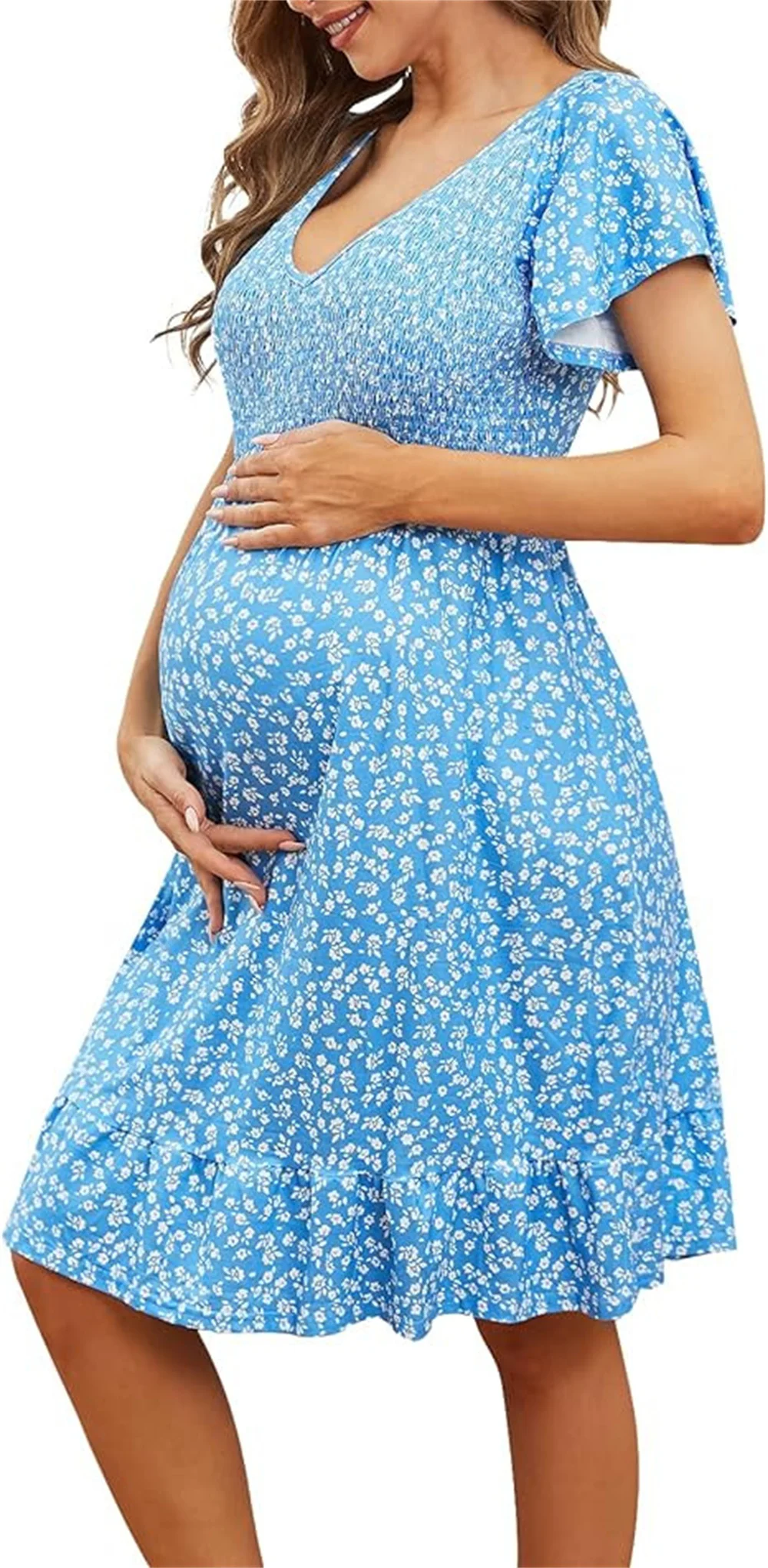 Vestido de maternidad de verano 2025, nuevo estilo, transpirable, con cuello en V, Floral, holgado, cómodo, informal, vestido de manga corta, diseño de cintura delgada