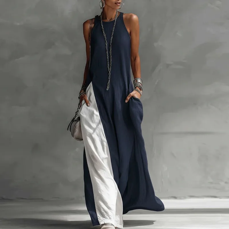 Vestido Maxi Casual sin Mangas para Verano, Estilo Boho, para Vacaciones, Sexy, con Cuello Redondo, Color en Contraste, Vestido Largo con Bolsillos, Estilo A-Line, para Fiesta