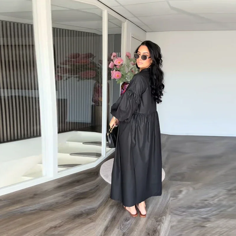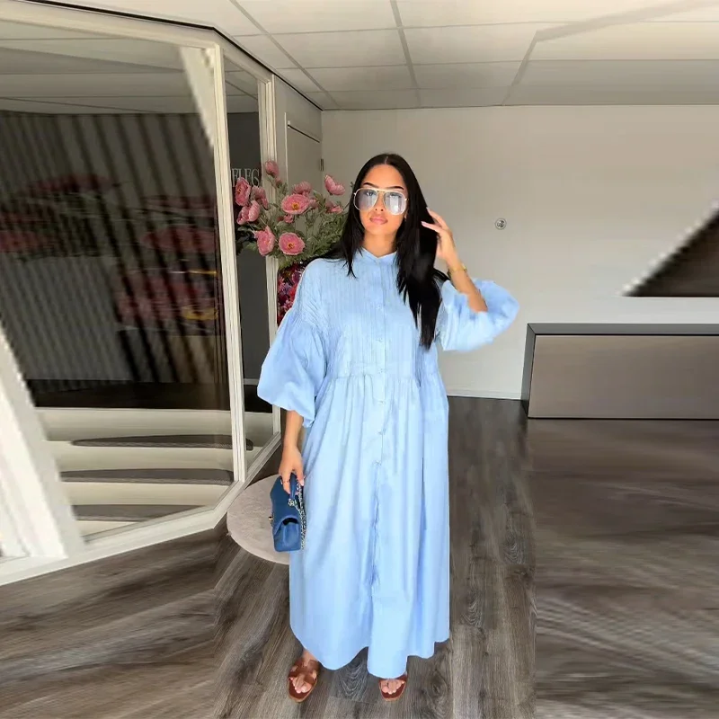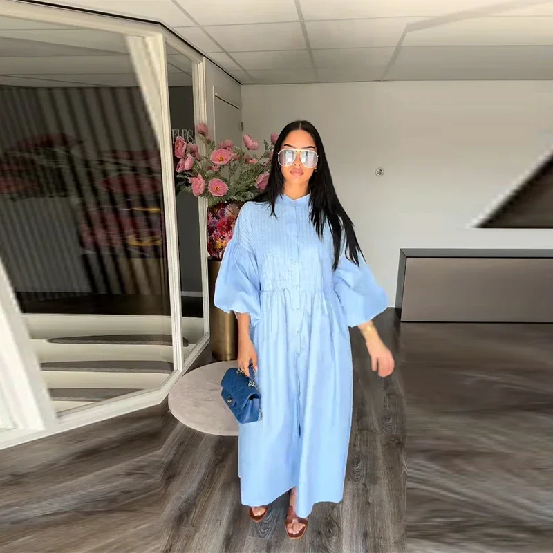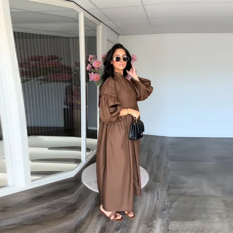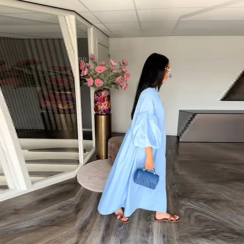 Vestidos lisos de un solo pecho para mujer, vestido plisado con cuello redondo y manga acampanada para mujer, batas femeninas de cintura alta informales elegantes 2025