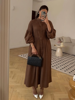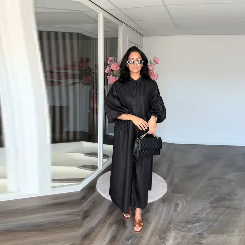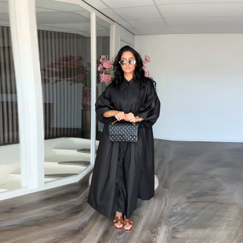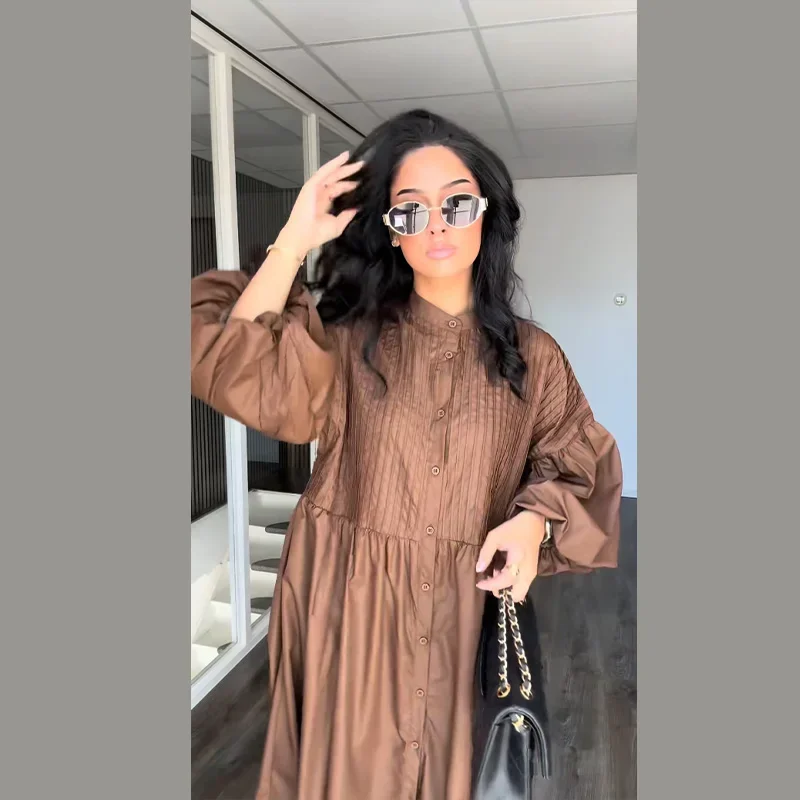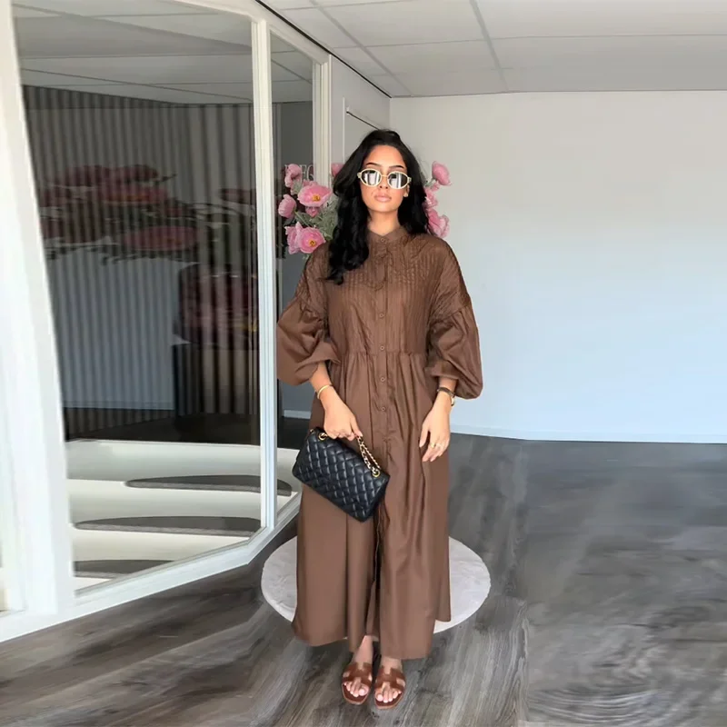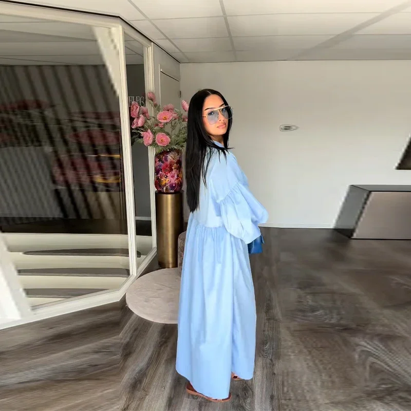 Vestidos lisos de un solo pecho para mujer, vestido plisado con cuello redondo y manga acampanada para mujer, batas femeninas de cintura alta informales elegantes 2025